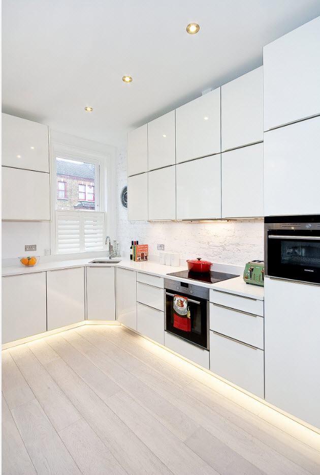 - при угловом расположении мебельного ансамбля удается интегрировать максимально возможное количество систем хранения на минимальной площади полезного пространства кухни;