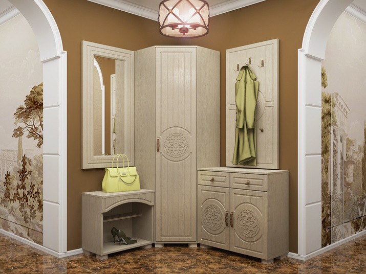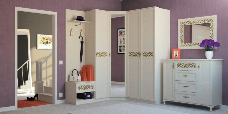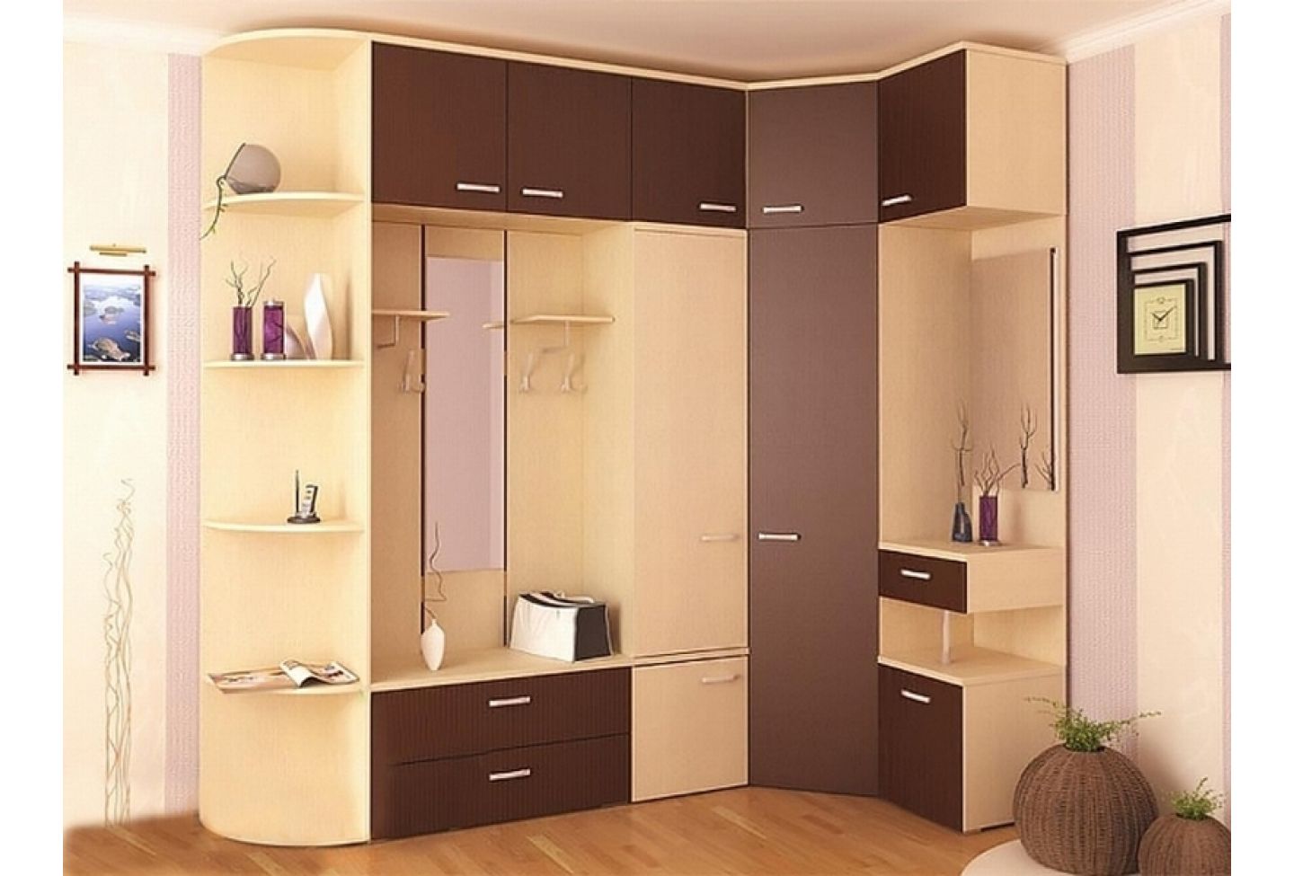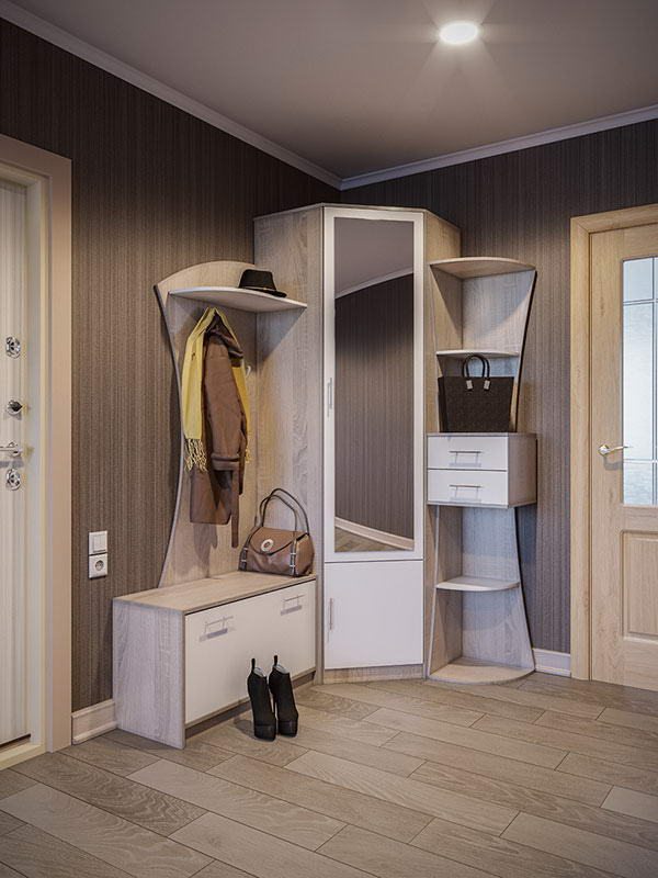 Качественный дизайн прихожей приятен для глаз, удобен и функционален. Угловая прихожая позволяет рационально и эффективно использовать площадь небольшой комнаты, в том числе углы. Внутренняя часть мебели рационально и компактно оборудована необходимыми системами хранения, спрятанными за мебельными фасадами. Также угловая прихожая отличается безопасностью при эксплуатации, потому что в дизайне преобладают плавные линии, углы скошены, закрытые прямоугольные шкафы сочетаются с закругленными открытыми полками.