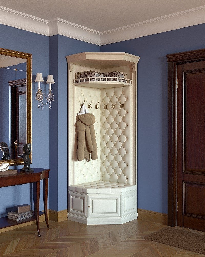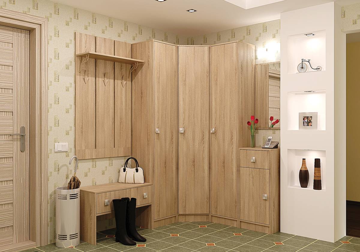 Мебельные конструкции для прихожей с использованием углового пространства бывают открытыми или закрытыми. Для красивого внешнего дизайна и комфортного использования угловой мебели для прихожей закрытые и открытые элементы комбинируют. Изготавливают такую мебель из натурального дерева, древесно-стружечных и древесно-волокнистых плит, а также, пластика, состоящего исключительно из искусственных материалов. Угловая мебель имеет несколько основных видов: объемный и вместительный шкаф-купе угловой конструкции, модульная мебель, расположенная вдоль стен с угловым элементом, минималистичный радиусный шкаф, разнообразные встроенные шкафы и гарнитуры.