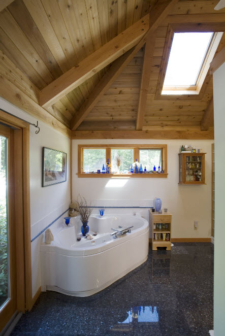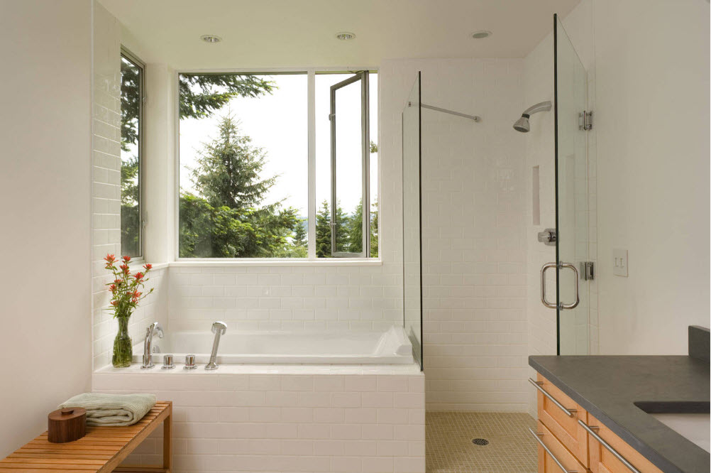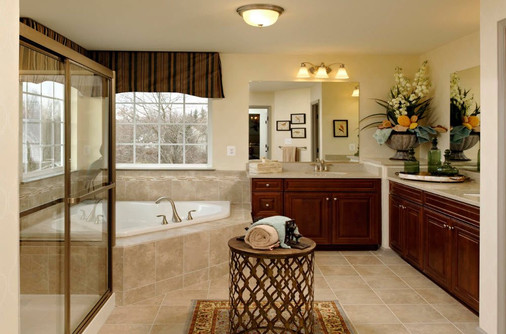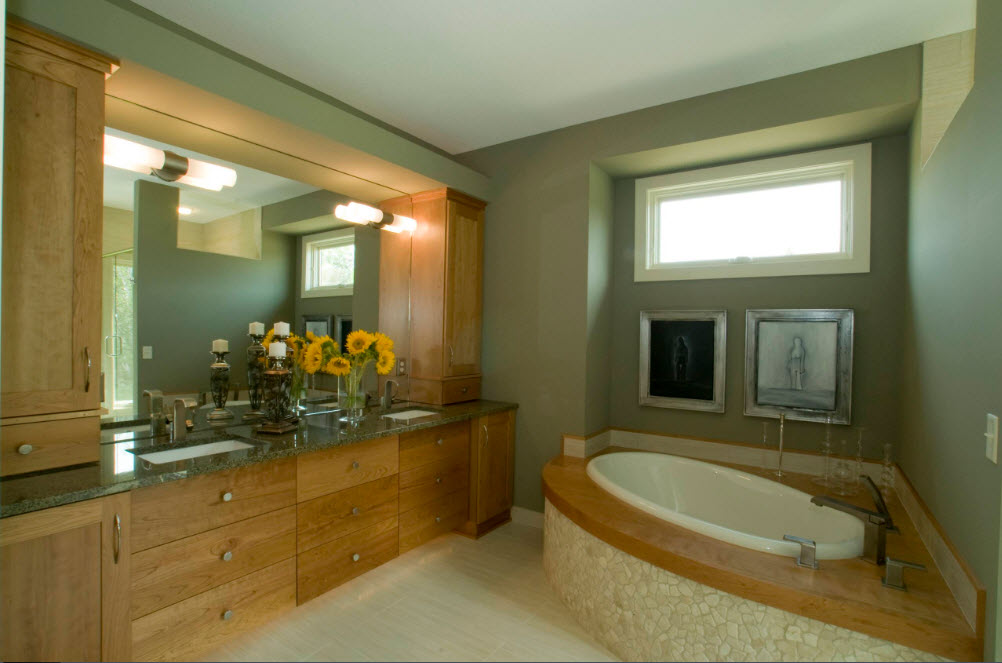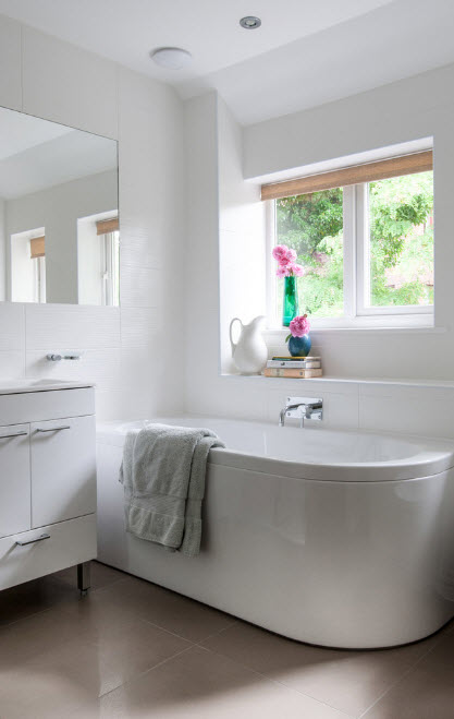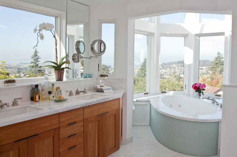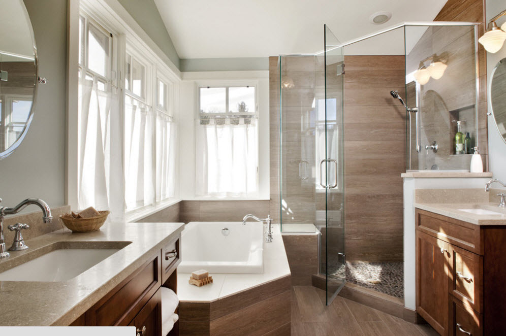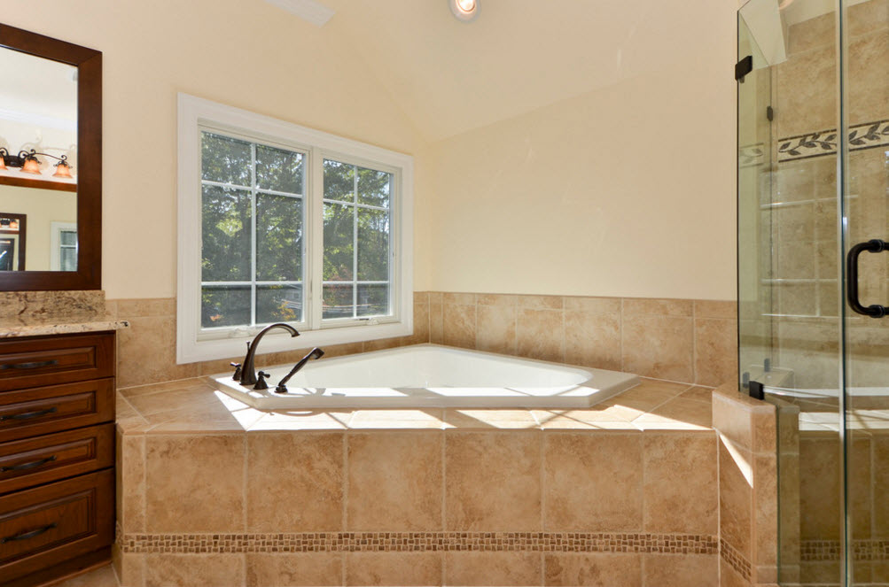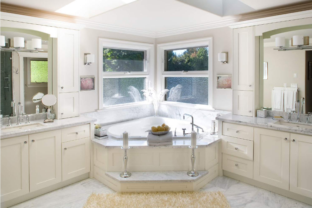 Парадоксально, но в угол помещения можно встроить и ванну круглой или овальной формы. Сама купель может иметь любую форму, важна лишь особенность обустройства каркаса сооружения. Например, для ванных комнат с эркером (в частных домах и такое возможно) подобная модель может стать находкой.