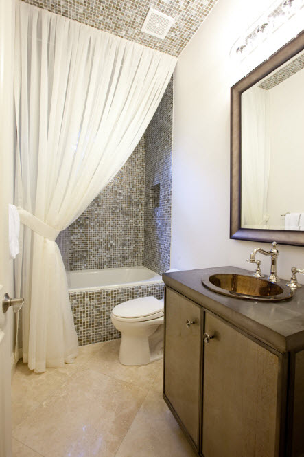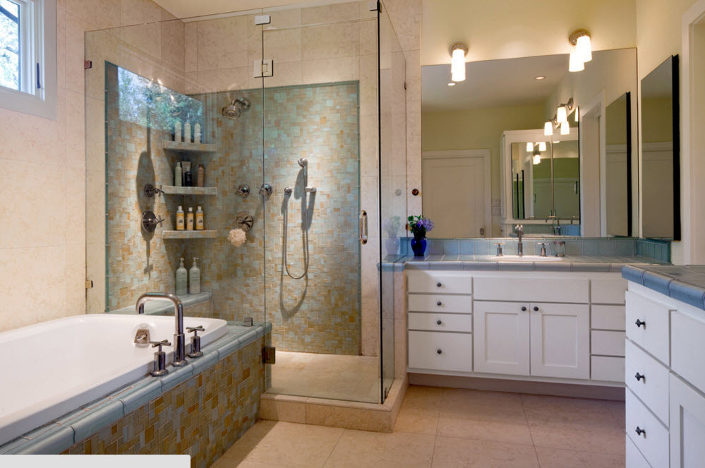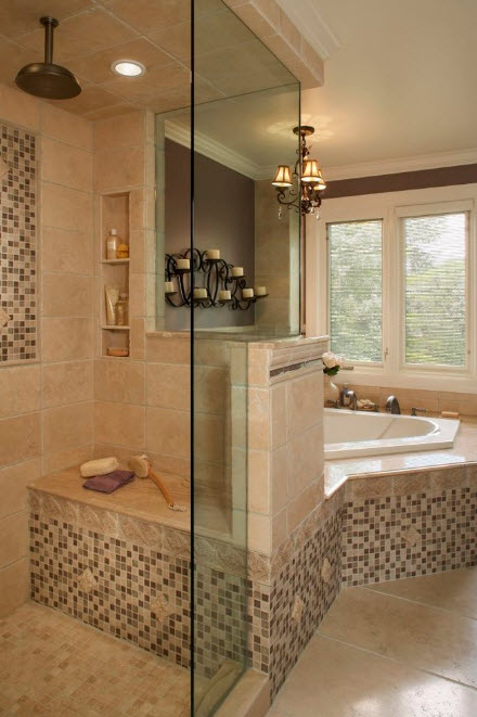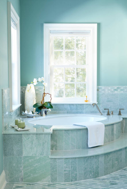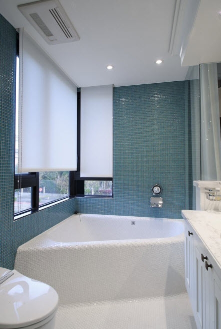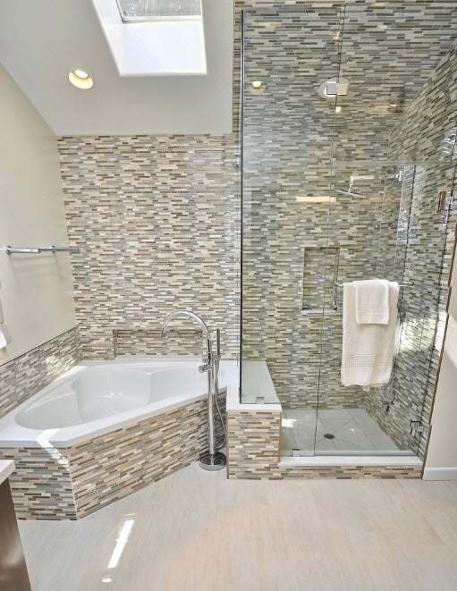 Перед вами пример того, как можно облицевать фасад угловой ванны с помощью мозаичной плитки с очень мелкими элементами. Преимущество керамической мозаики в том, что она способна повторять все плавные изгибы сооружений и создавать надежную и внешне привлекательную облицовку, защищающую поверхности от влаги и различных видов воздействий.