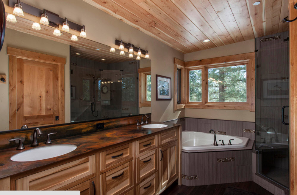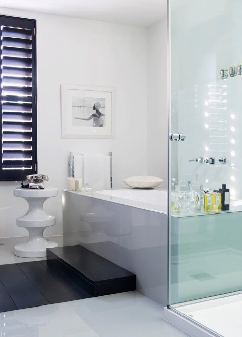 Осуществить облицовку фасада угловой ванны можно не только при помощи керамической плитки или мозаики, но и использовании материала, из которого изготовлены системы хранения вашей ванной комнаты. В результате получается невероятно гармоничный образ всего помещения, в котором элементы обстановки отлично сочетаются друг с другом.