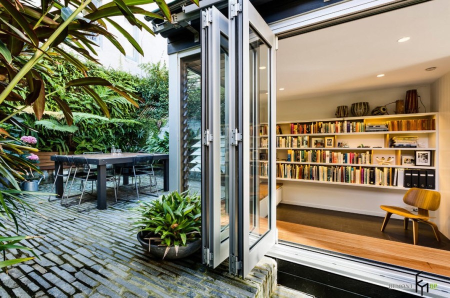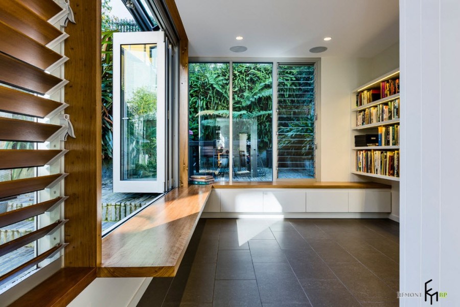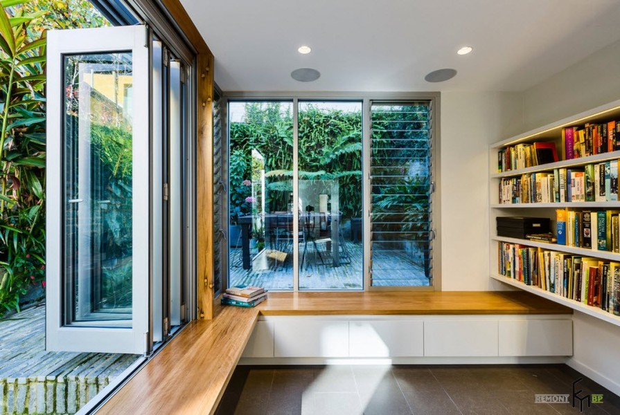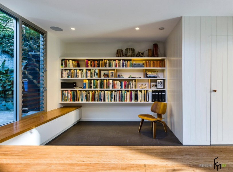 Комнату, прилегающую к веранде, можно сделать чем-то вроде библиотеки. Разместите вдоль стены нишу с книгами и больше ничего. Ну, разве что стул можно добавить.