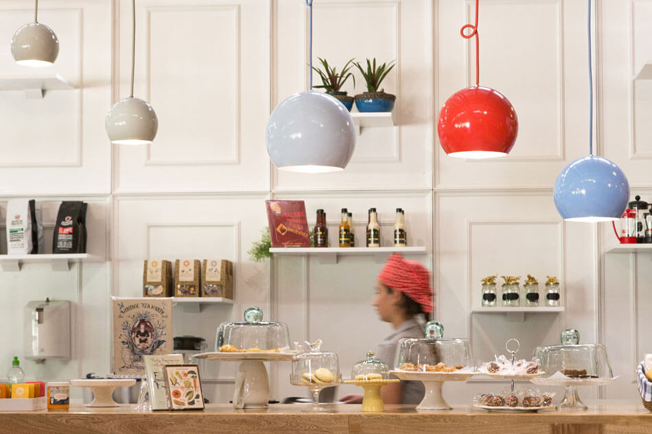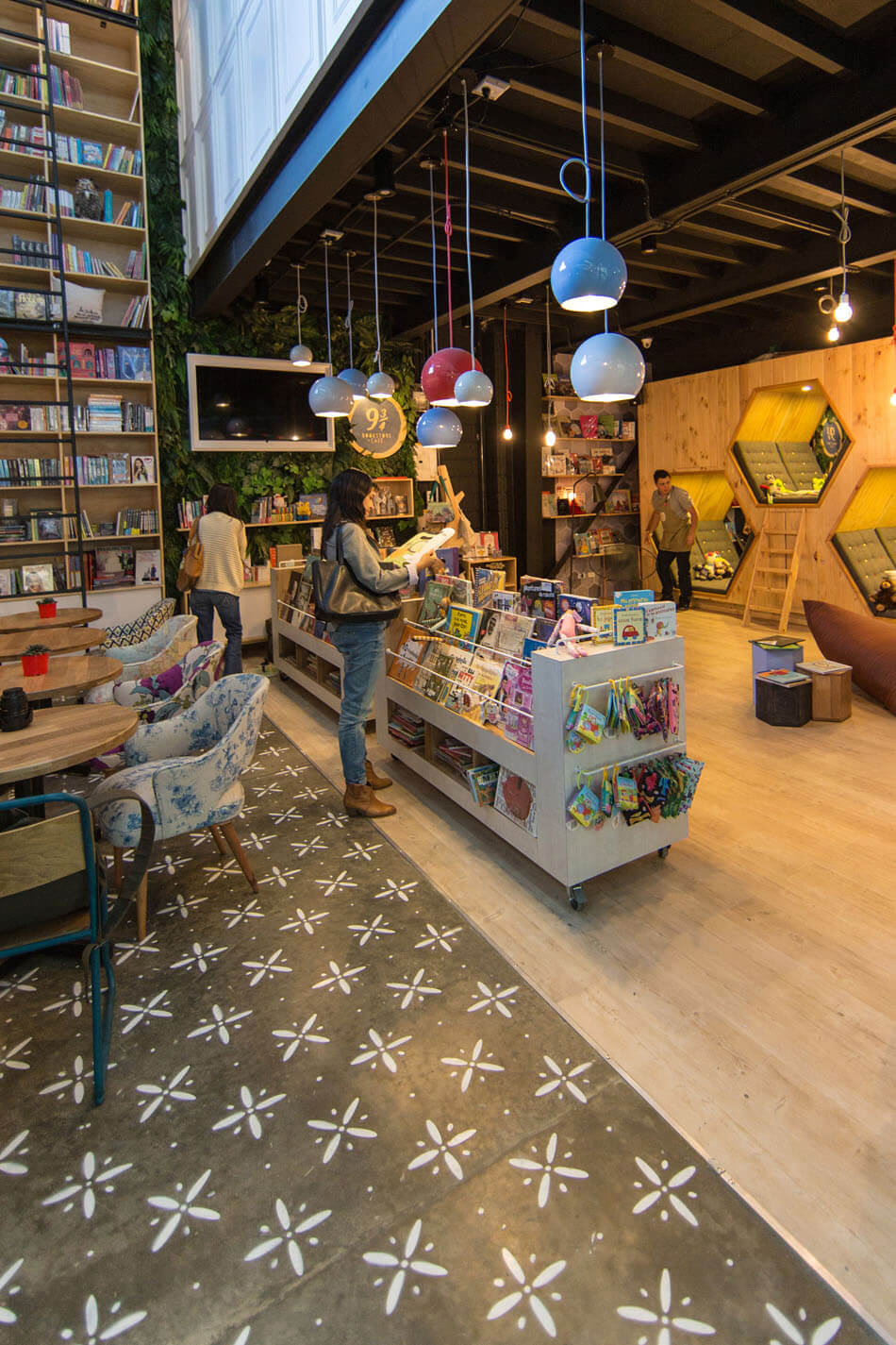Очевидно, что столь большое пространство книжного магазина нуждается в высоком уровне освещенности, ведь после покупки книги здесь можно остаться и прочесть ее. Разнообразные подвесные светильники в этом случае помимо своей основной функции исполняют и роль декоративных элементов. Например, плафоны разного цвета акцентно смотрятся на светлом фоне отделки зоны прилавков со сладостями, чаем и кофе.
