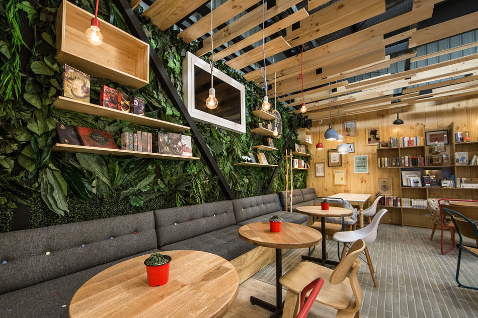 Изюминкой интерьера книжного магазина-кафе стала зеленая стена с живыми растениями. Невозможно представить какой еще элемент интерьера способен привносить в пространство столько свежести и близости к природе. В сочетании с предметами отделки и декора из светлой древесины, «живая стена» смотрится особенно органично. Деревянные доски, подвешенные над потолком, не только очерчивают границы помещения по высоте, но и делают дизайн магазинчика более уютным, даже домашним.