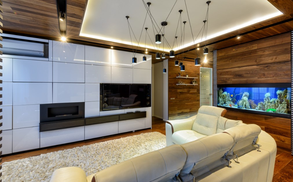 От люстр в принципе отказались практически все стили в интерьере, за исключением дворцовой классики. А точечные светильники, некогда украшающие многоуровневые потолки, стали заменять LED-подсветкой. Последняя характеризуется простотой в использовании и более доступной стоимостью. При наличии LED-ленты, оснастить подсветкой шкафы, полки и другие детали можно своими руками.