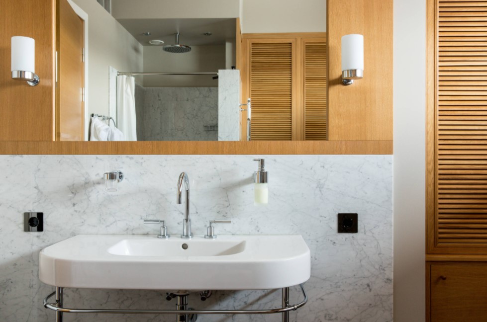 В пример можно взять накладную раковину из натурального камня и красивую тумбу из настоящего мрамора или хотя бы вид под настоящий мрамор. Для бюджетного варианта можно подобрать красивую плитку, имитирующую настоящий натуральный мрамор.