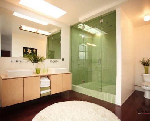 Отличным украшением ванной комнаты станет душевая кабинка, контрастная по отношению к общему цветовому фону. Это может быть контраст цветов или контраст, полученный за счет встроенной в нее подсветки. Главное, чтобы она была неким островком в пространстве комнаты.