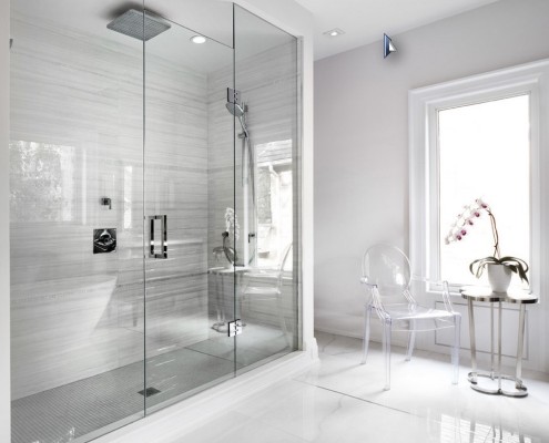 Если предыдущий вариант дизайна является достаточно сложным, то установка поддона и его ограждение от остальной части комнаты прозрачной перегородкой будет самым простым делом. В результате душевая кабинка зрительно не занимает пространство, не требует особых решений по ее включению в общий цветовой фон ванной комнаты. Она как бы не существует.