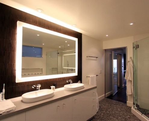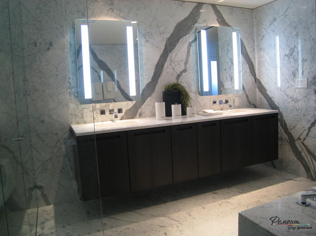 В случае установки широкого зеркала оптимальным вариантом будет расположение светильников снизу и сверху. Но здесь лучше использовать скрытые источники света.
