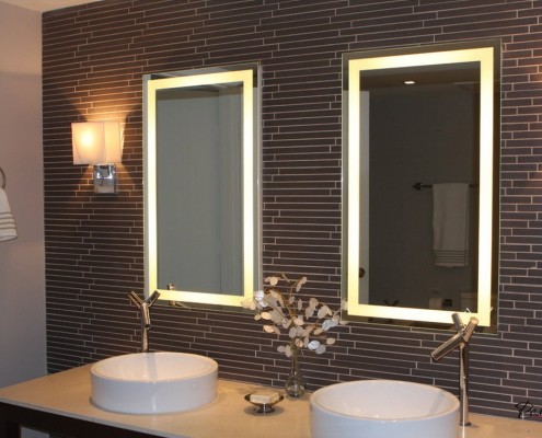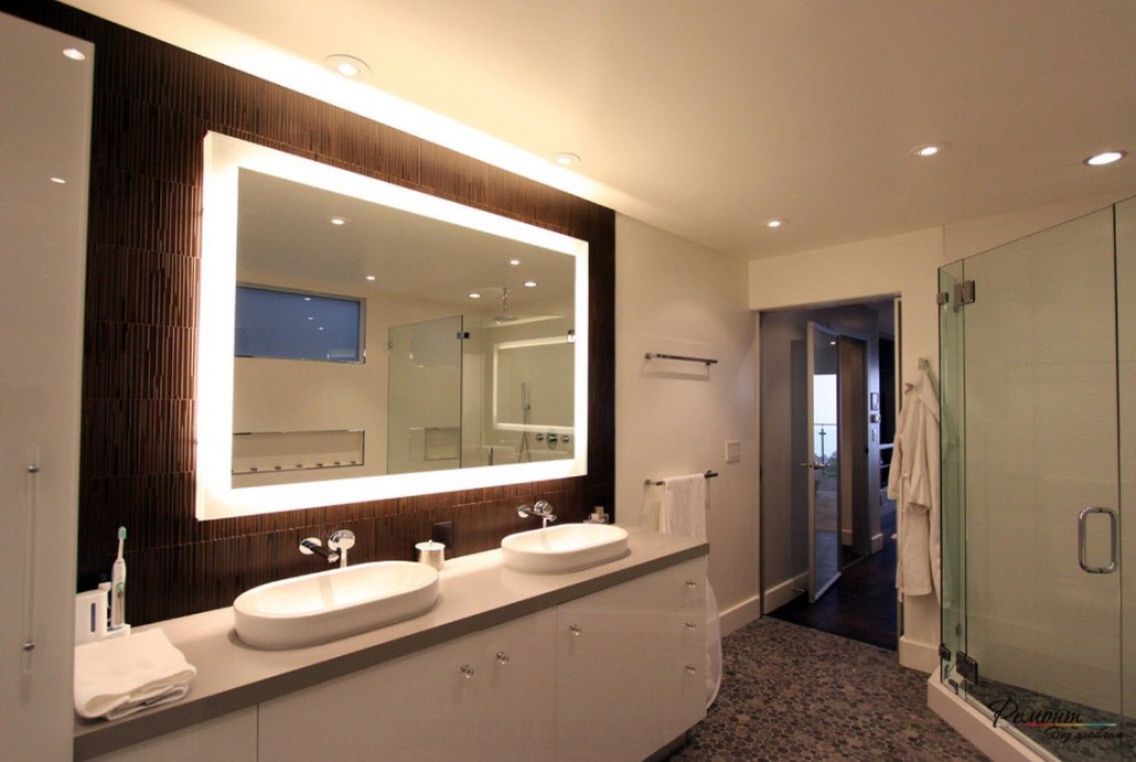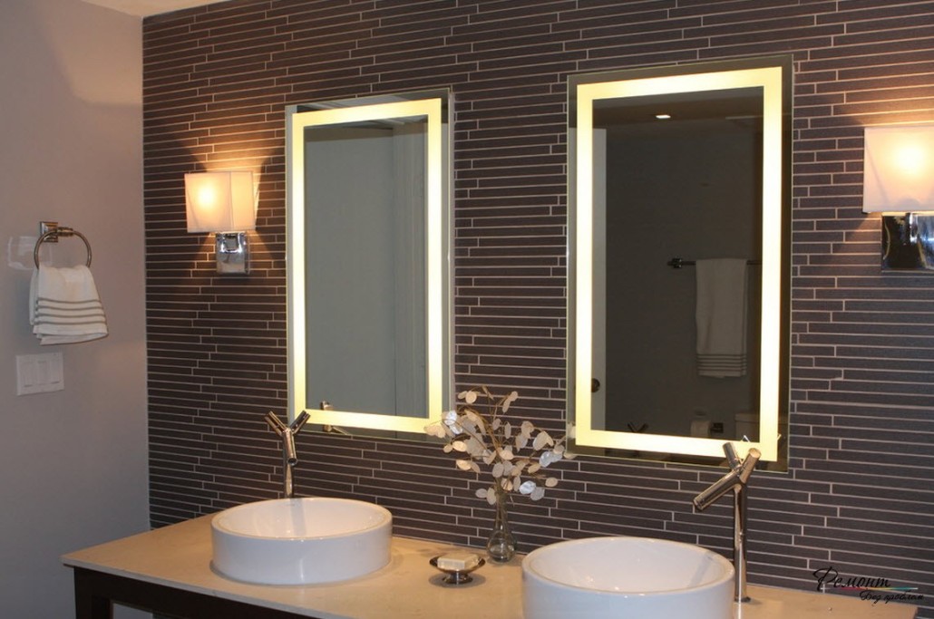 Самым «крутым» будет зеркало, имеющее встроенные светильники. Чаще всего подсветка делается по периметру или по бокам.