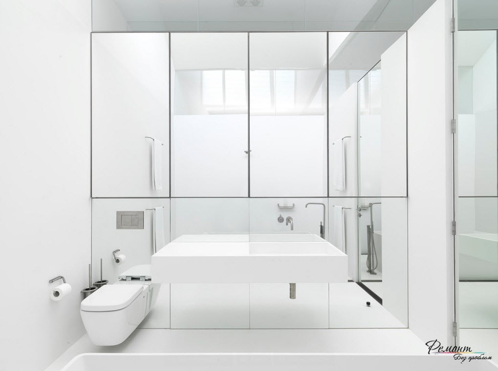 Но если вы, воодушевленные такими расчетами, задумаете сделать из ванной комнаты королевство зеркал, то получите довольно неприятное ощущение от множества отражений. Специалисты не рекомендуют использовать такую «экономию».