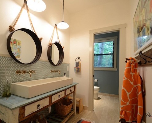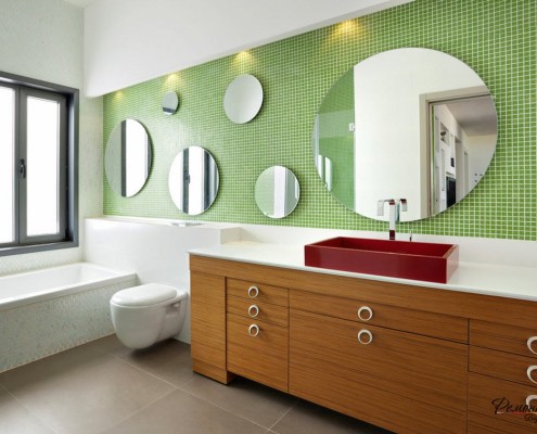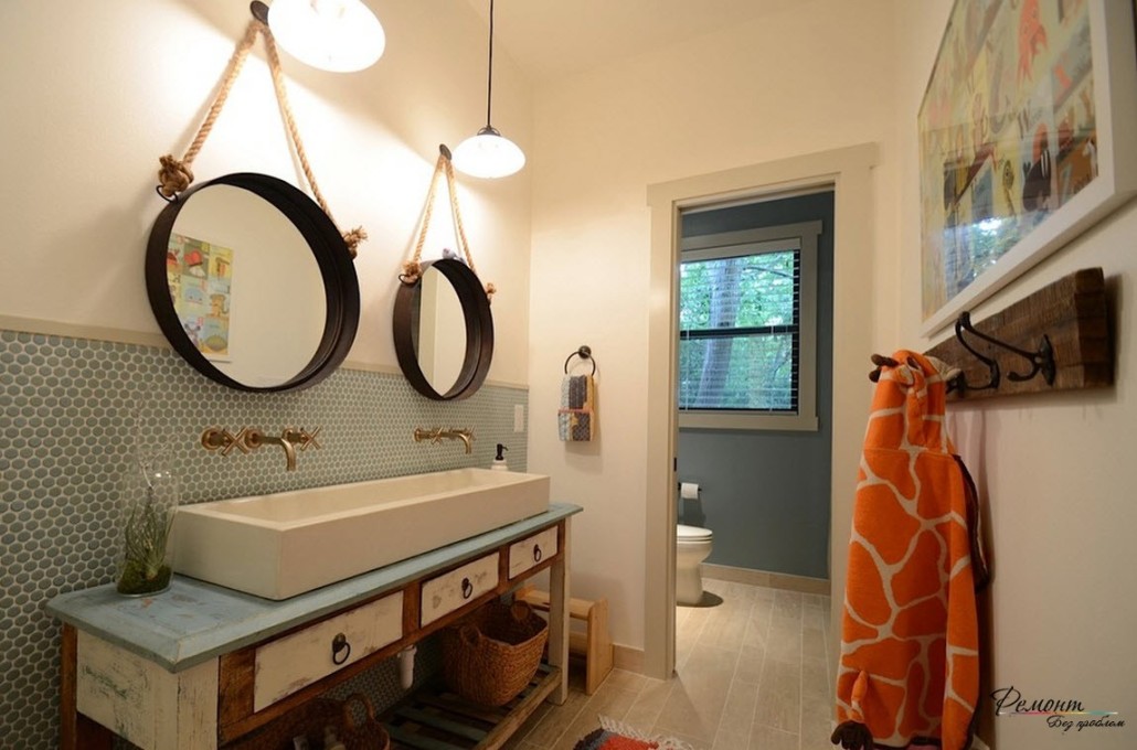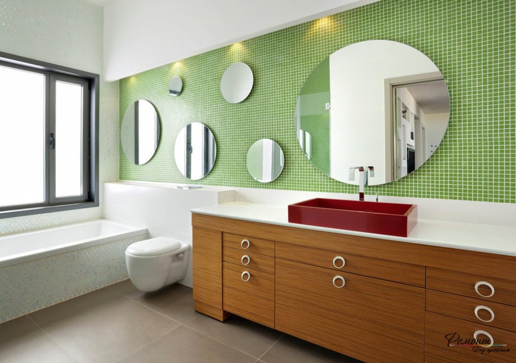 Чтобы привнести в дизайн ванной комнаты определенную оригинальность, можно установить круглое зеркало или овальное. Оригинально выглядит зеркало-трансформер – при необходимости “легким движением руки” превращается в трельяж.