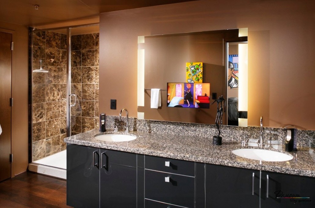 Некоторые типы зеркал имеют встроенные светильники, что позволяет иметь в ванной комнате дополнительное освещение. А для самых изощренных потребителей выпускаются зеркала с встроенным видеоплеером и подогревом. Последняя функция предотвращает запотевание зеркало и продлевает, соответственно, срок его службы.