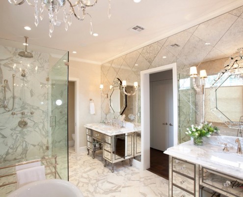 Для того, чтобы увеличить пространство, облицовывают всю стену или ее часть зеркалами. Кстати, если сравнить затраты на облицовку одного квадратного метра стены керамической плиткой или зеркалом, то вы будете удивлены результатом – затраты будут вполне соизмеримы. А если вы делаете облицовку стен плиткой премиум класса, то зеркальная стена вам обойдется гораздо дешевле. Вот такая математика.