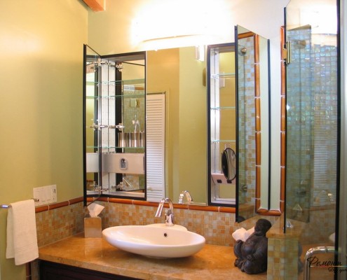 - зеркало, встроенное в мебель. Такая мебель обычно изготавливается на заказ, так как вас в ней будет интересовать именно зеркало. Чаще – это зеркальные шкафы, как навесные, так и напольные. Установка зеркала-шкафа – превосходный вариант для интерьера ванной комнаты, особенно небольших размеров. Шкаф многофункционален – зеркало, полки для хранения вещей и встроенное освещение избавят вас от необходимости покупать это все по отдельности. Налицо тройная выгода – зеркало, шкаф с полками и освещение.