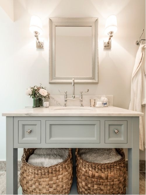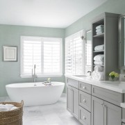 Но, как говорится, не единым белым. Конечно, допускаются и пастельные оттенки, близкие к природным – песочный, серый, светло-оливковый, голубой. Удачно разбавить общий тон можно с помощью ярких деталей, к примеру, полотенец, коврика насыщенного синего, желтого или зеленого цвета.