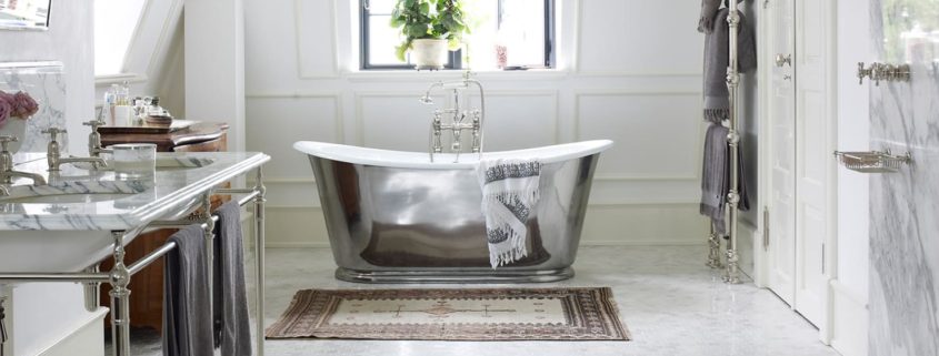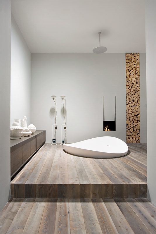 Единственным исключением может стать ванна в стиле спа, рассчитанная на достаточную площадь помещения. Расположите ванну по центру и погрузите ее в пол. Наполнив ее ароматной пеной и приукрасив комнату соответствующими косметическими средствами, вы действительно почувствуете себя как в спа-салоне. Усилить эффект скандинавского стиля поможет небольшая дровяная печь и поленница.