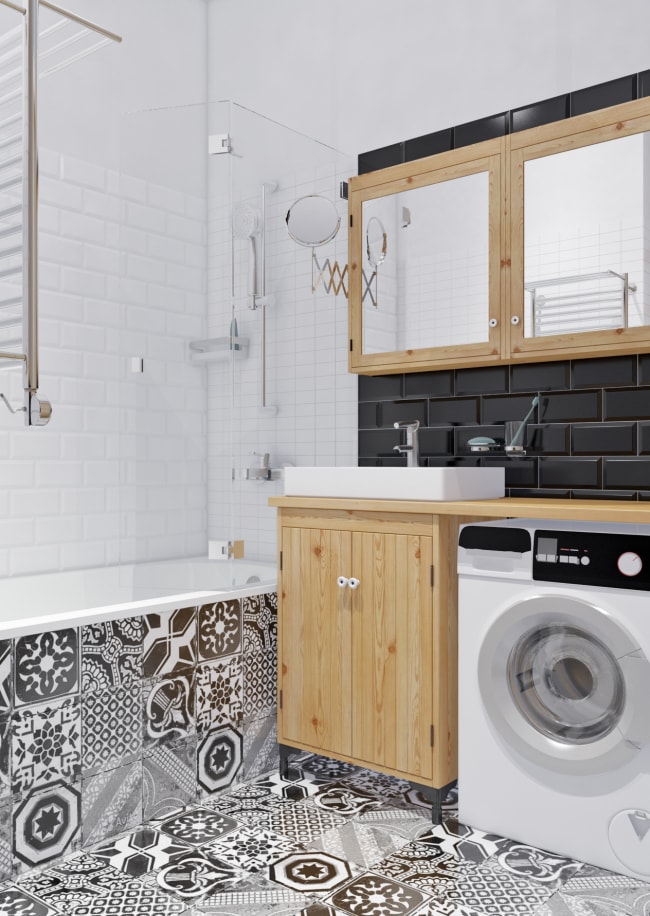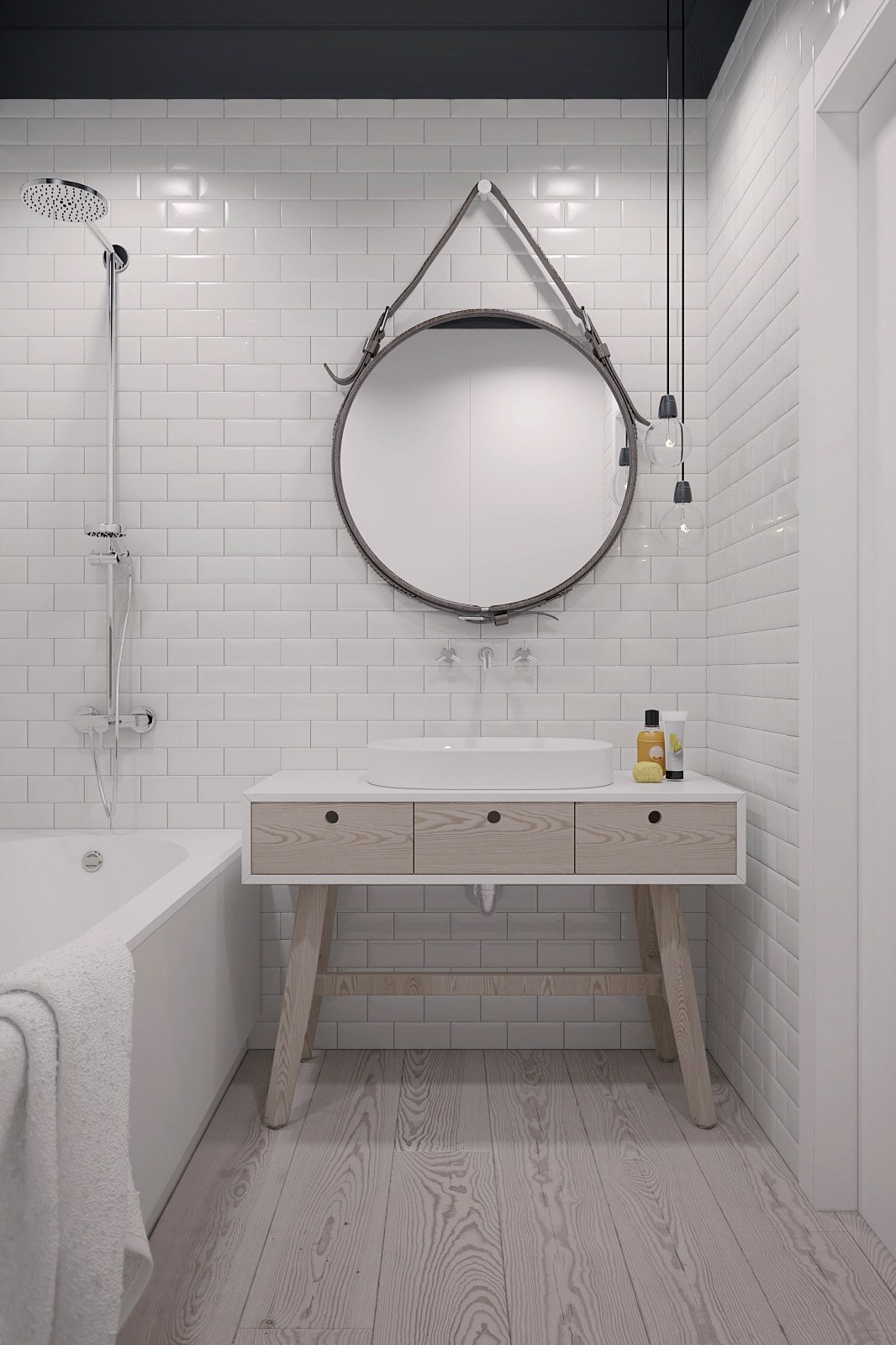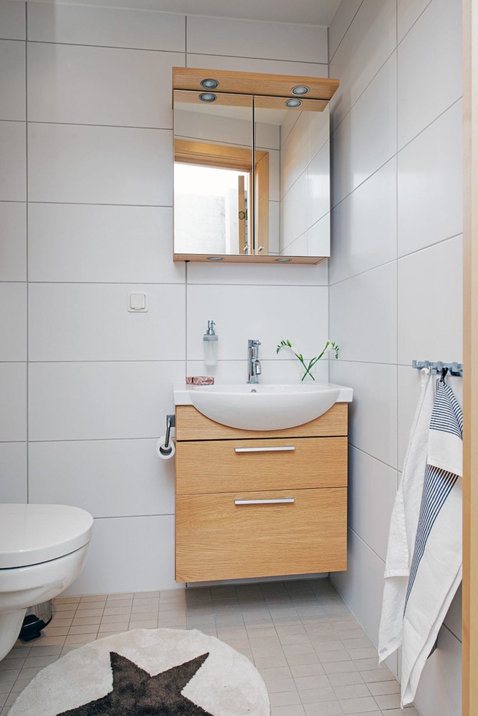 В скандинавском интерьере доминируют дерево и камень, но в ванной такая комбинация не всегда уместна и возможна из-за высокой цены и плохой влагостойкости деревянных материалов. Поэтому много дерева здесь лучше не использовать, однако можно сделать деревянные полочки, столешницу или поставить корзину для белья.