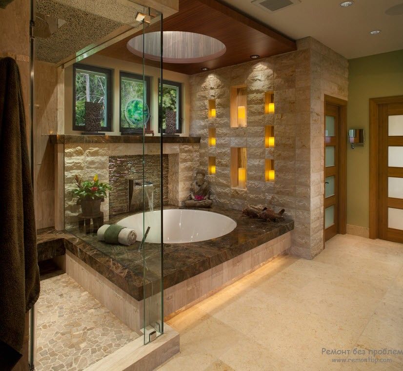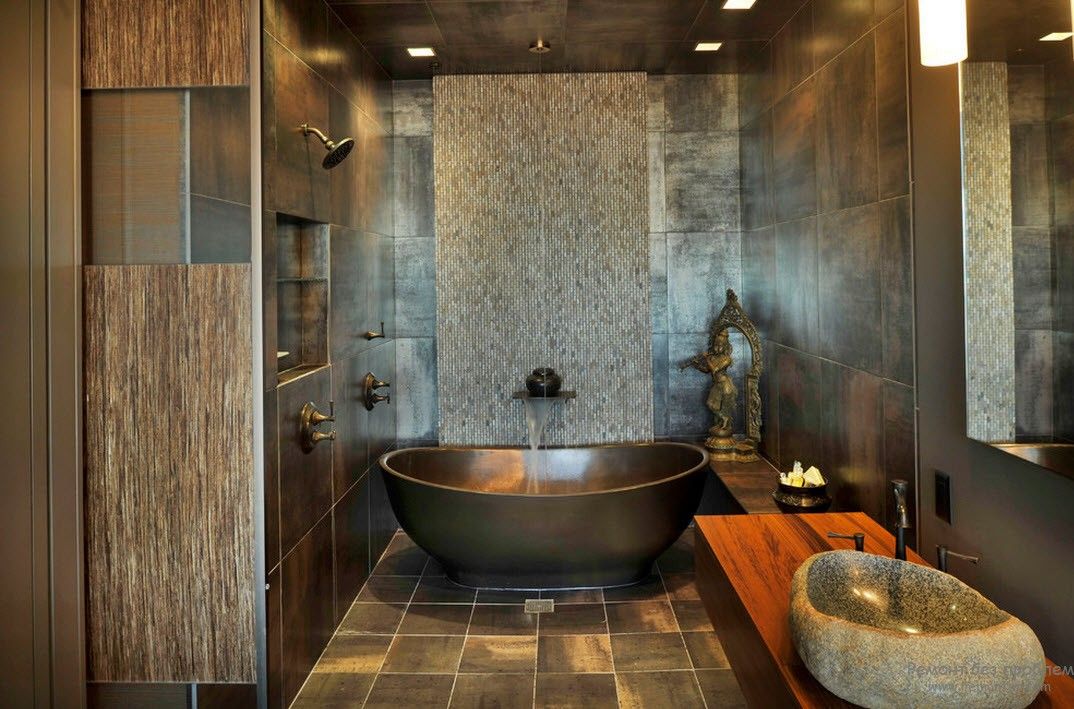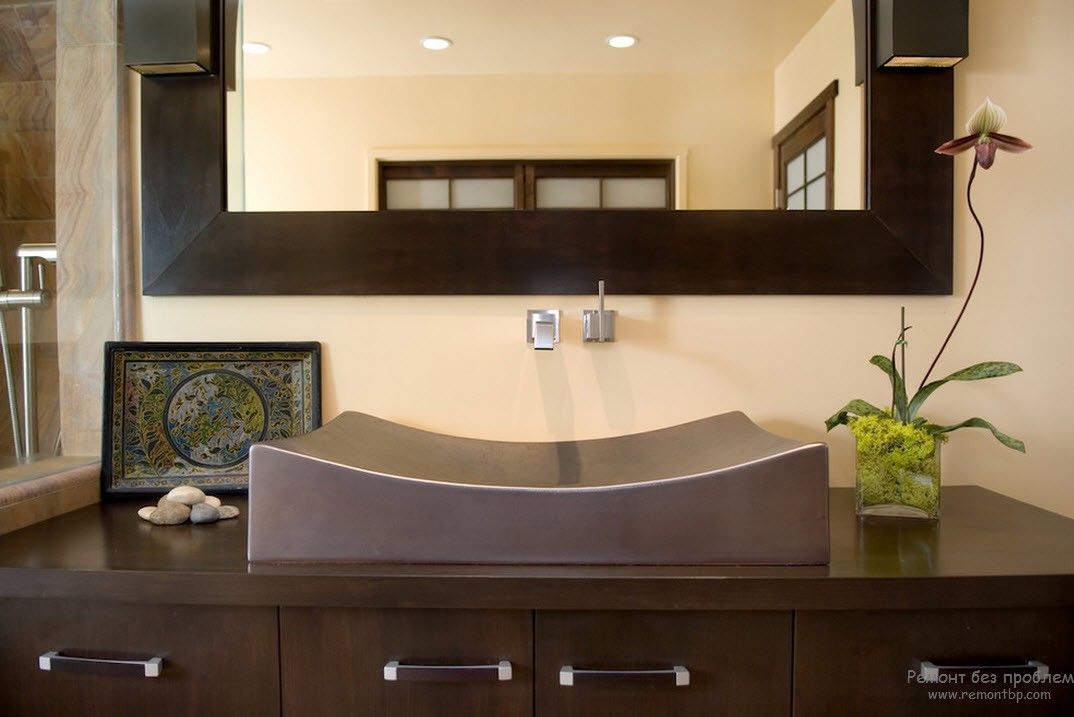 Декорируя ванную в японском стиле, следует помнить, что его главной ценностью является пространство, элегантная простота, отсутствие лишних деталей. Можно ограничиться цветовыми комбинациями, рисунком кафеля с растительными узорами в пастельных тонах, использованием гальки, фактурной плитки. Выбирая скульптурную фигурку или настенное панно, предпочтительно остановиться на каком-то одном варианте. Элементом декора могут стать циновки, коврики и живые растения. Пейзаж за окном может оказаться чудесным украшением интерьера , а в отсутствии красивого вида можно воспользоваться плёнкой с ландшафтным рисунком.