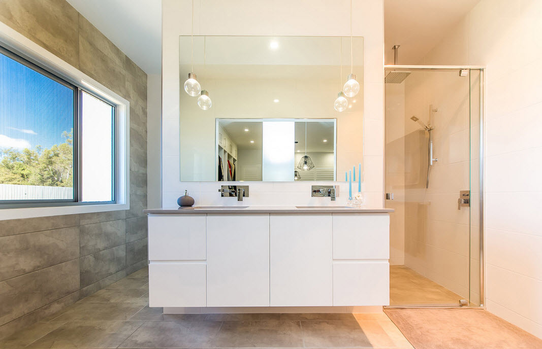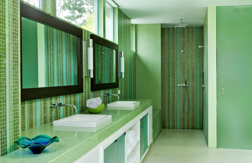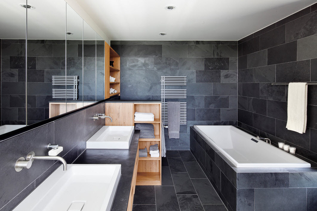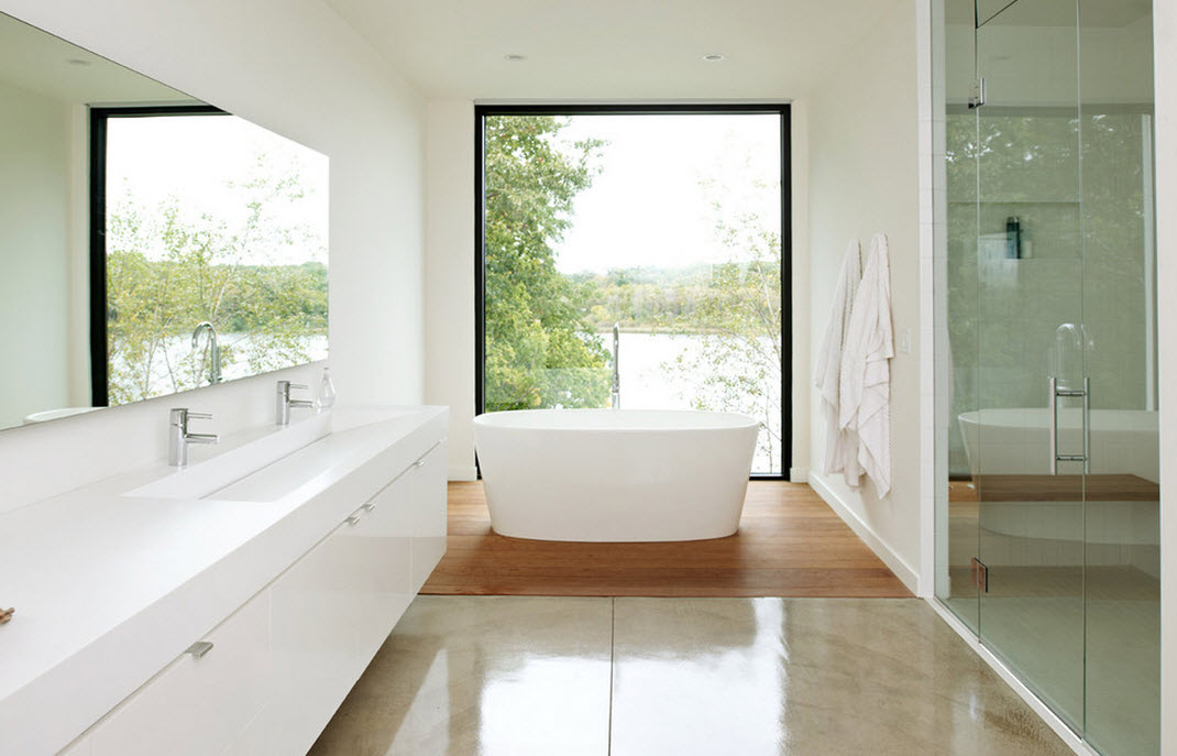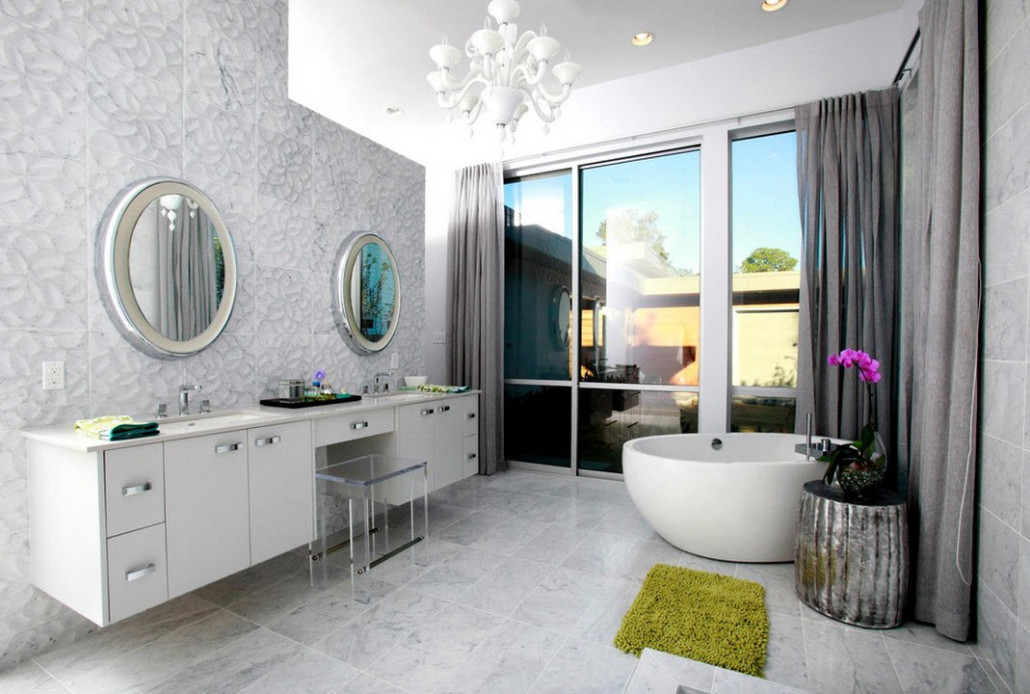 В светлом интерьере ванной разноцветные или более темные полы подчеркнут свежесть основного фона. Например, зеленая мозаичная плитка на полу рифмуется с пейзажем за окном, а черный керамогранит визуально приподнимает пространство ванной комнаты и создает иллюзию невесомости: