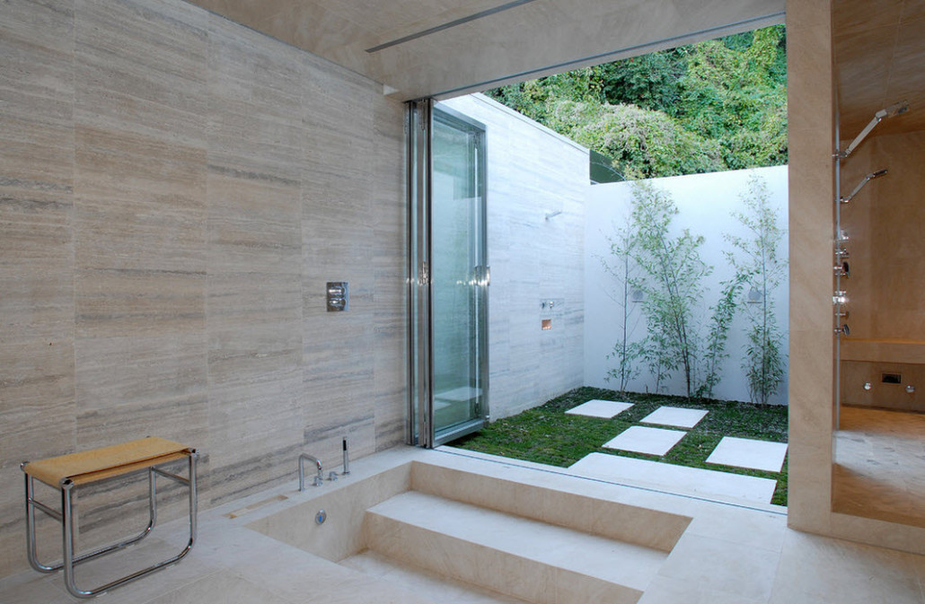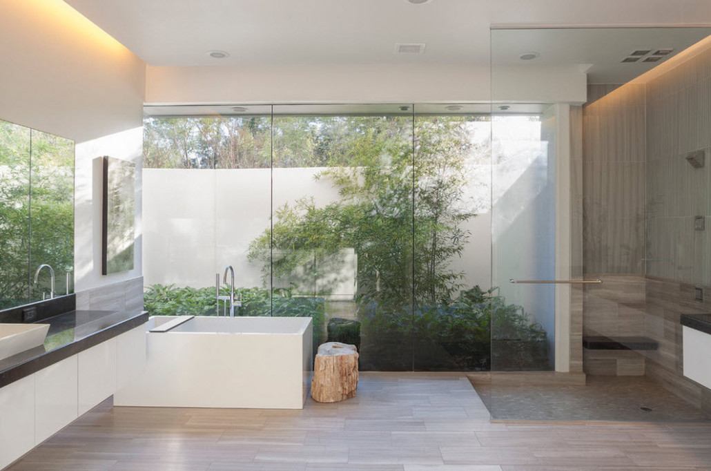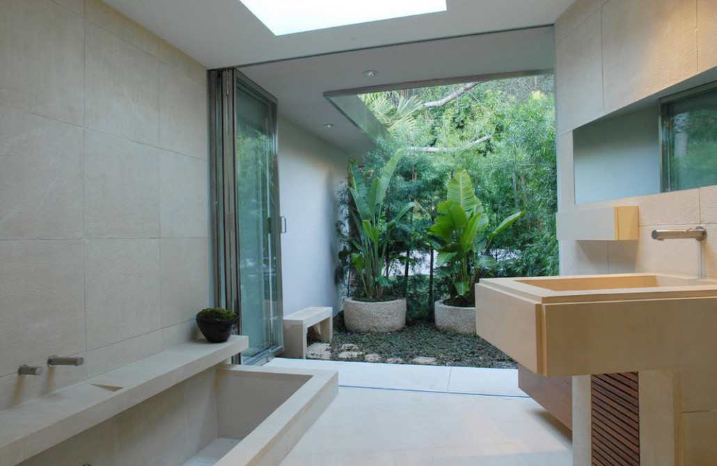 Ванные комнаты с выходом в зимний сад – это великолепно и экстравагантно. Если сделать ванну в углублении в полу, то выход в зеленую зону будет имитировать берег водоема: