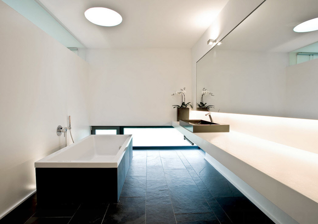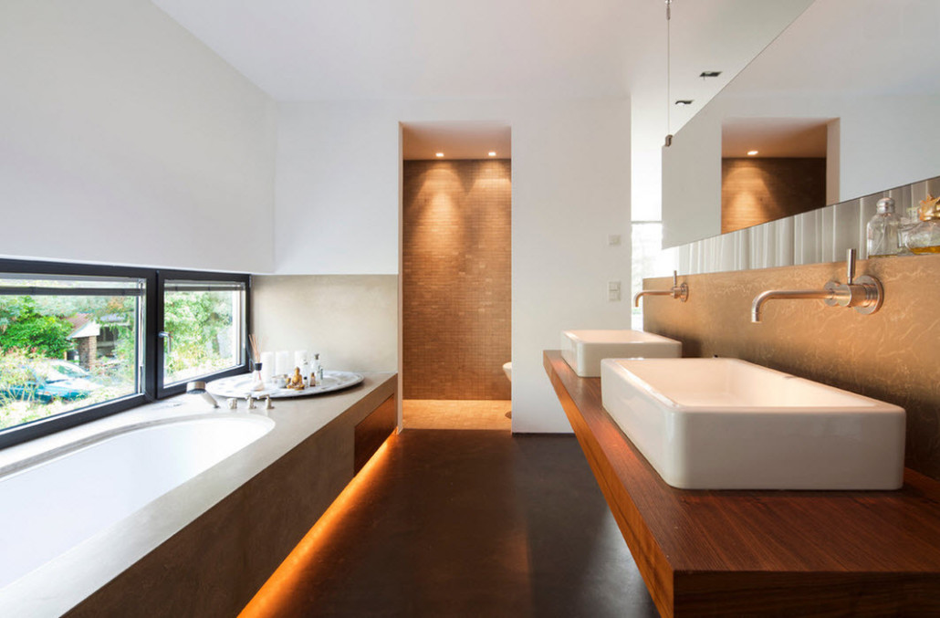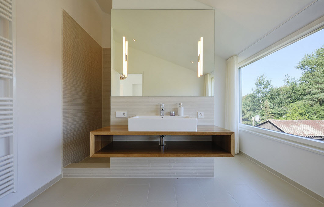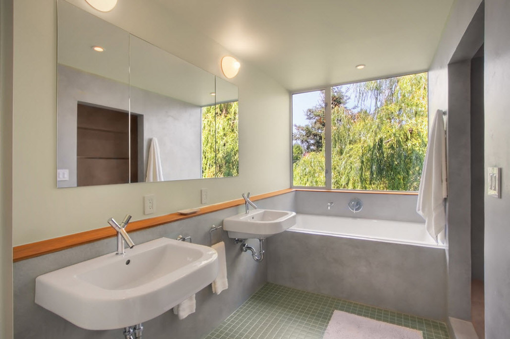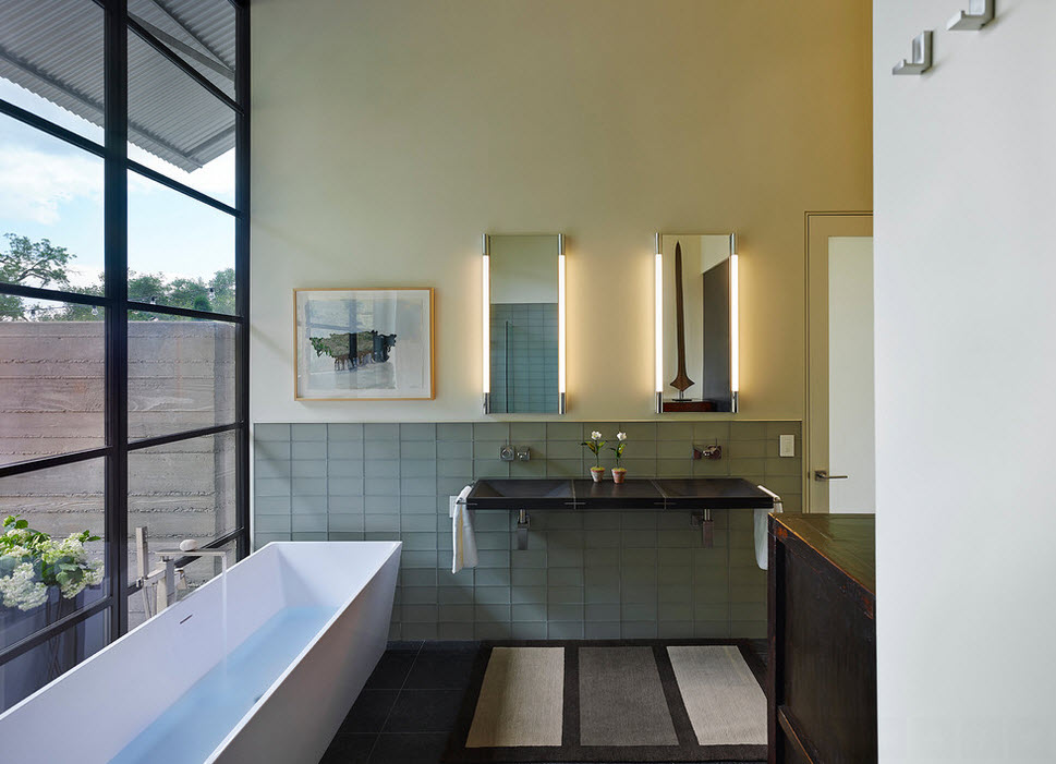 Узкие оконные проемы, сконструированные под самым потолком, позволят использовать стены для размещения сантехнических коммуникаций и обеспечат доступ солнечного света: