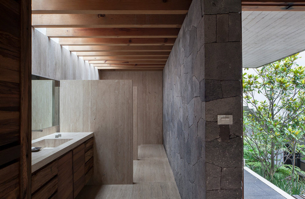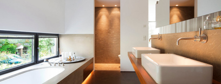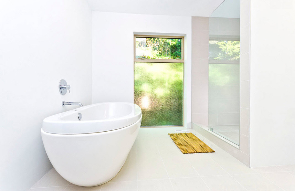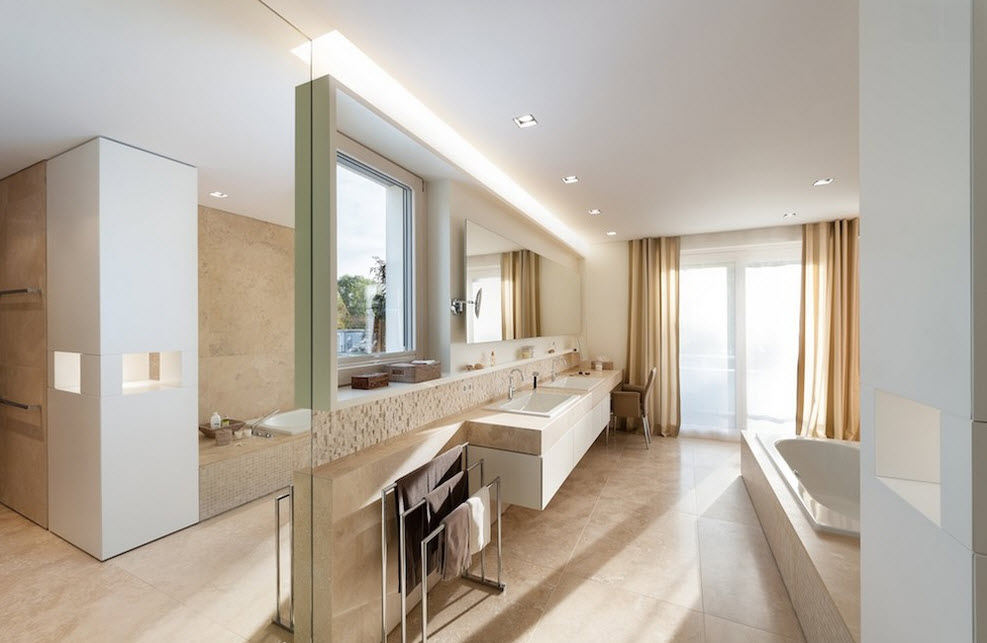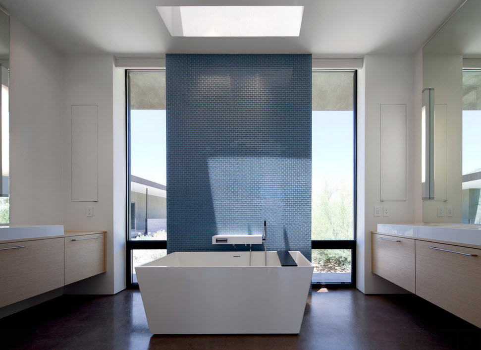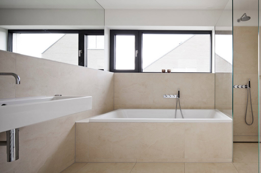 Узкие оконные проемы, сконструированные под самым потолком, позволят использовать стены для размещения сантехнических коммуникаций и обеспечат доступ солнечного света: