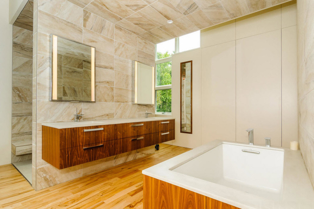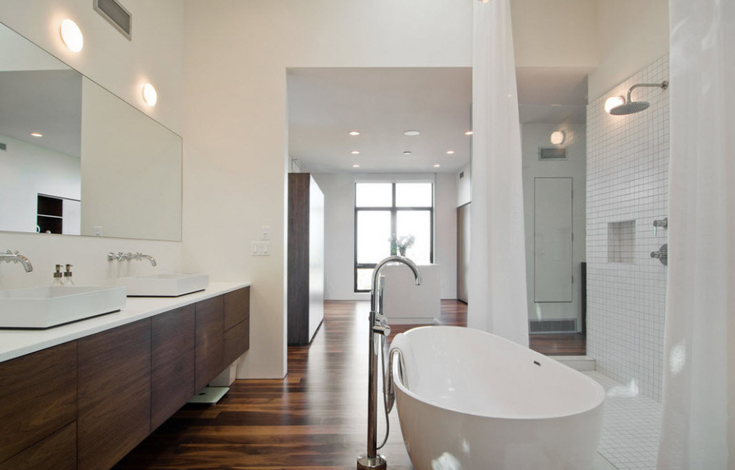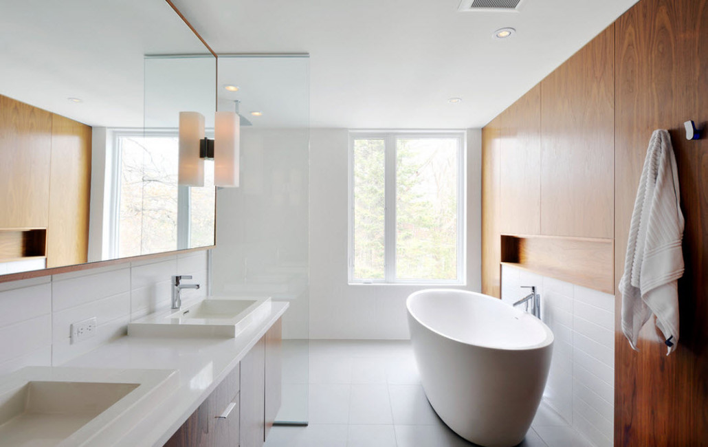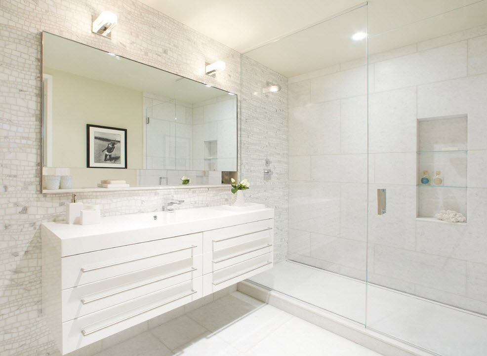 Ванные комнаты, оформленные в соответствии с требованиями модернизма, отличаются ощущением простора и света. Проекты по их обустройству отличаются рациональностью и функциональностью.