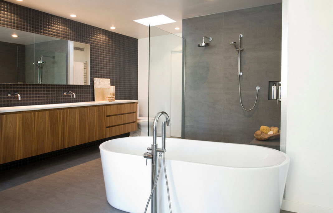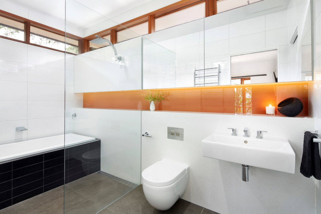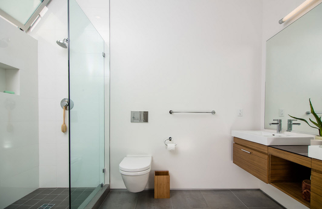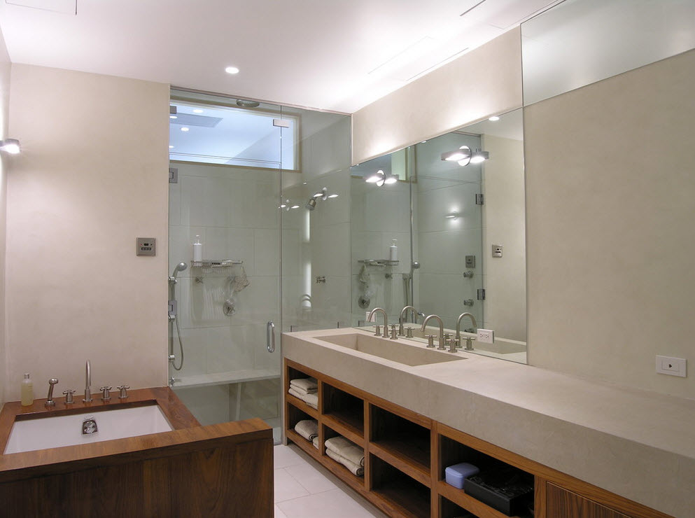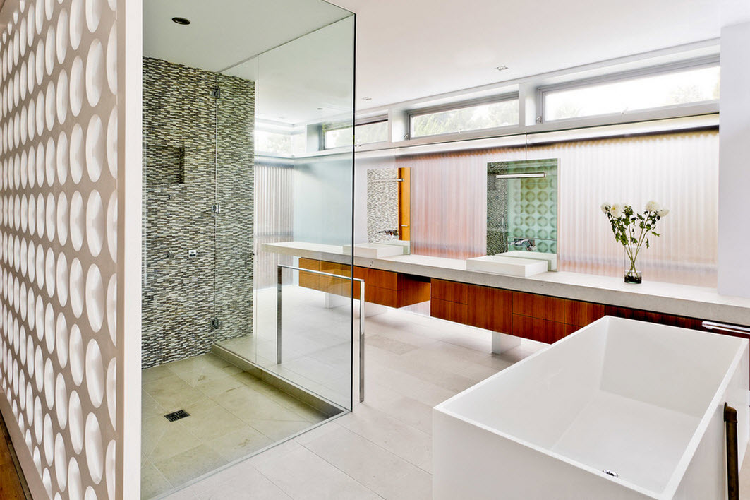Разделение территории на отдельные участки ванной комнаты в стиле модернизм ничем принципиальным не отличается от других стилей. Здесь могут быть использованы и цветовые границы, и перегородки, и материалы, отличающиеся друг друга фактурой. Стеклянные перегородки – наиболее распространенный способ зонирования в ванной комнате. Душевые кабинки могут быть отделены от общего помещения стенами из прозрачного или матового оргстекла: