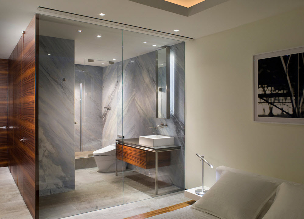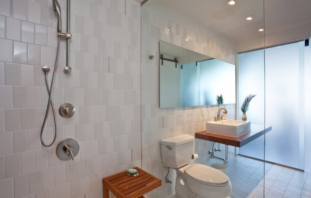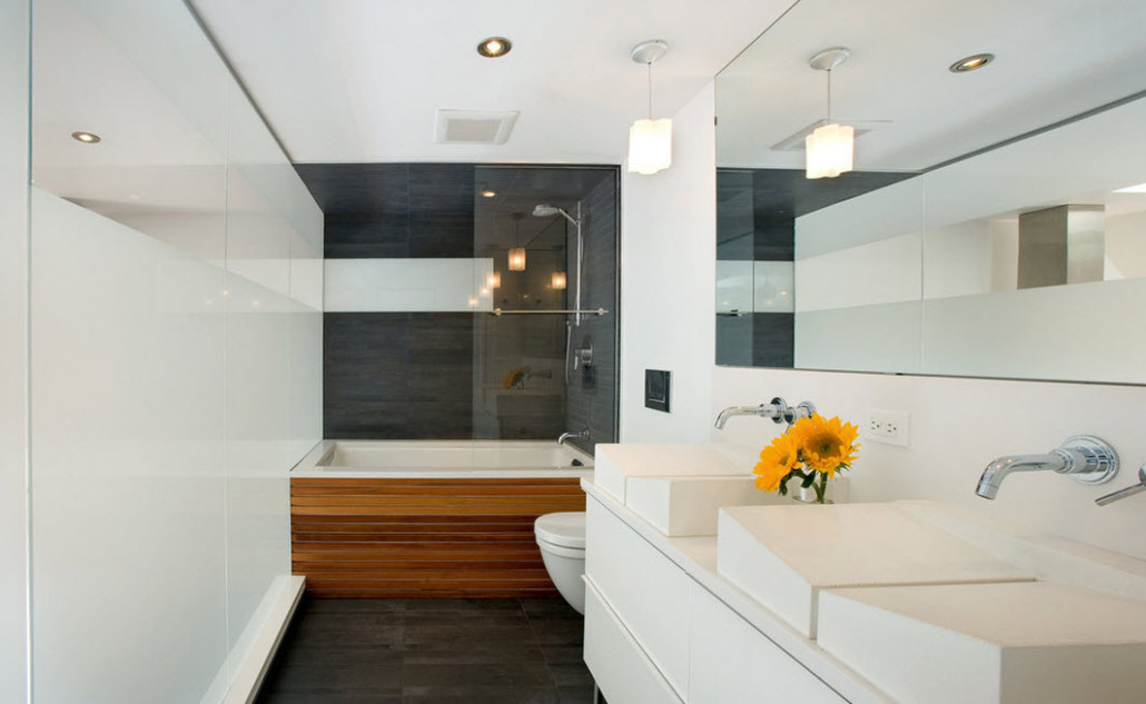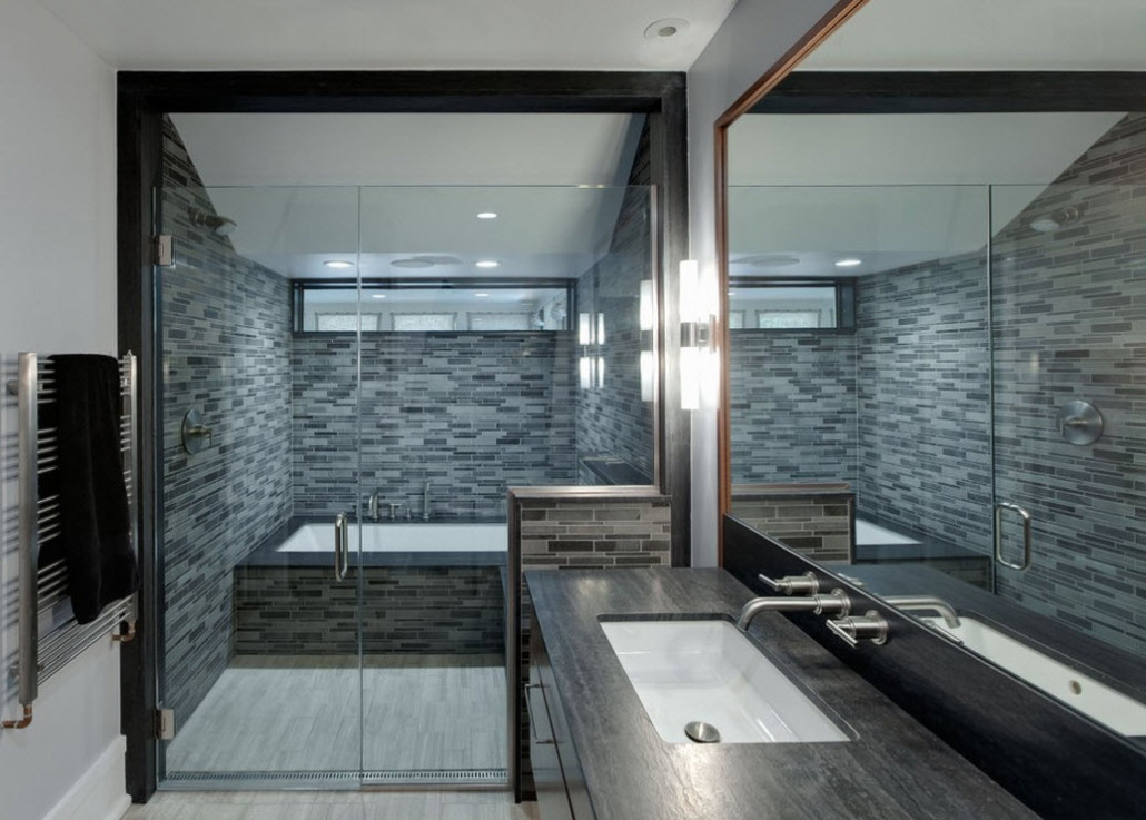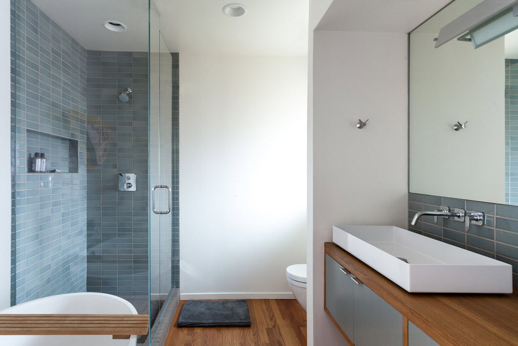Разделение территории на отдельные участки ванной комнаты в стиле модернизм ничем принципиальным не отличается от других стилей. Здесь могут быть использованы и цветовые границы, и перегородки, и материалы, отличающиеся друг друга фактурой. Стеклянные перегородки – наиболее распространенный способ зонирования в ванной комнате. Душевые кабинки могут быть отделены от общего помещения стенами из прозрачного или матового оргстекла: