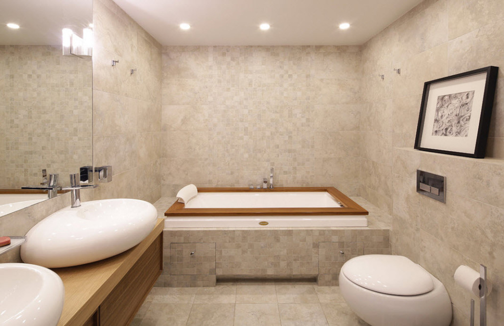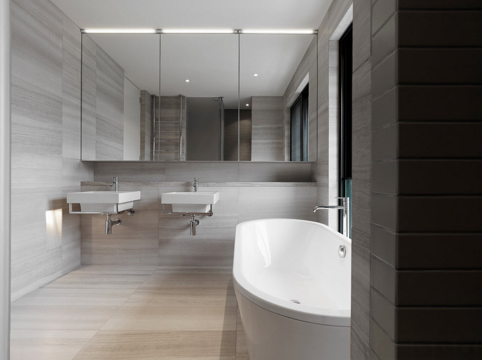 Для напольного покрытия в ванных комнатах стиля модернизм используется керамическая плитка, т.к. это наиболее практичный материал для помещений с повышенной влажностью. Существующие разновидности такого отделочного материала позволяют создать различные эффекты дизайна. Поскольку модернизм – это, прежде всего, рациональность, то специалисты рекомендуют использовать керамогранит для оформления пола: