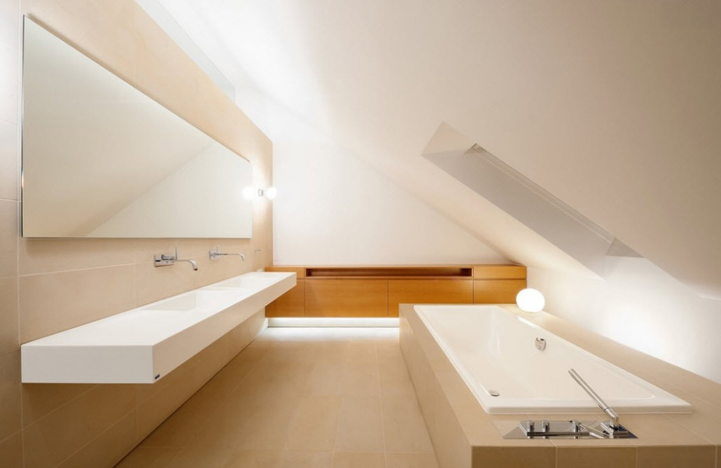 Ванная комната на мансардном этаже – это отличный способ сэкономить на отделке потолка и стен, т.к. они сливаются в одно целое. Разноуровневое освещение и светлый фон создают объемность этого помещения: