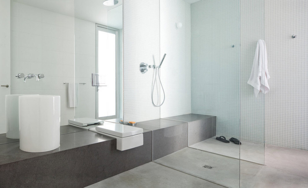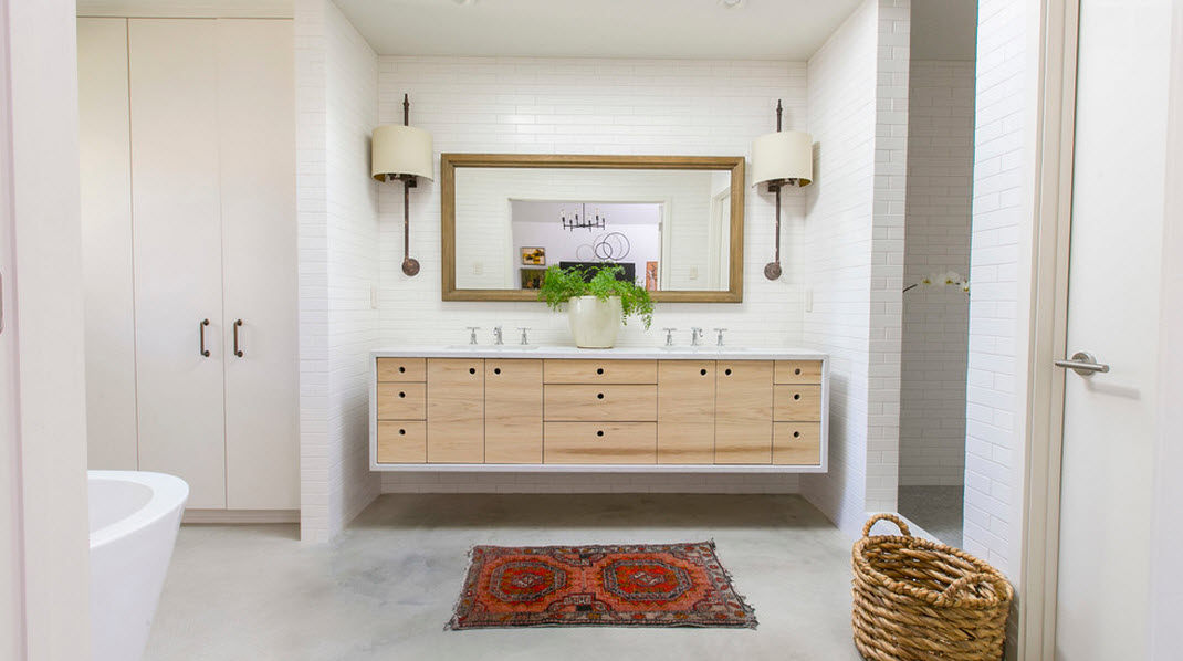 Наливной пол – идеальное решение для ванных в стиле модернизм. Отсутствие стыковых швов значительно увеличивает срок службы такого покрытия и предотвращает размножения бактерий и плесени. Кроме практичности, наливные полы выглядят очень эффектно, с их помощью можно преобразовать интерьер: