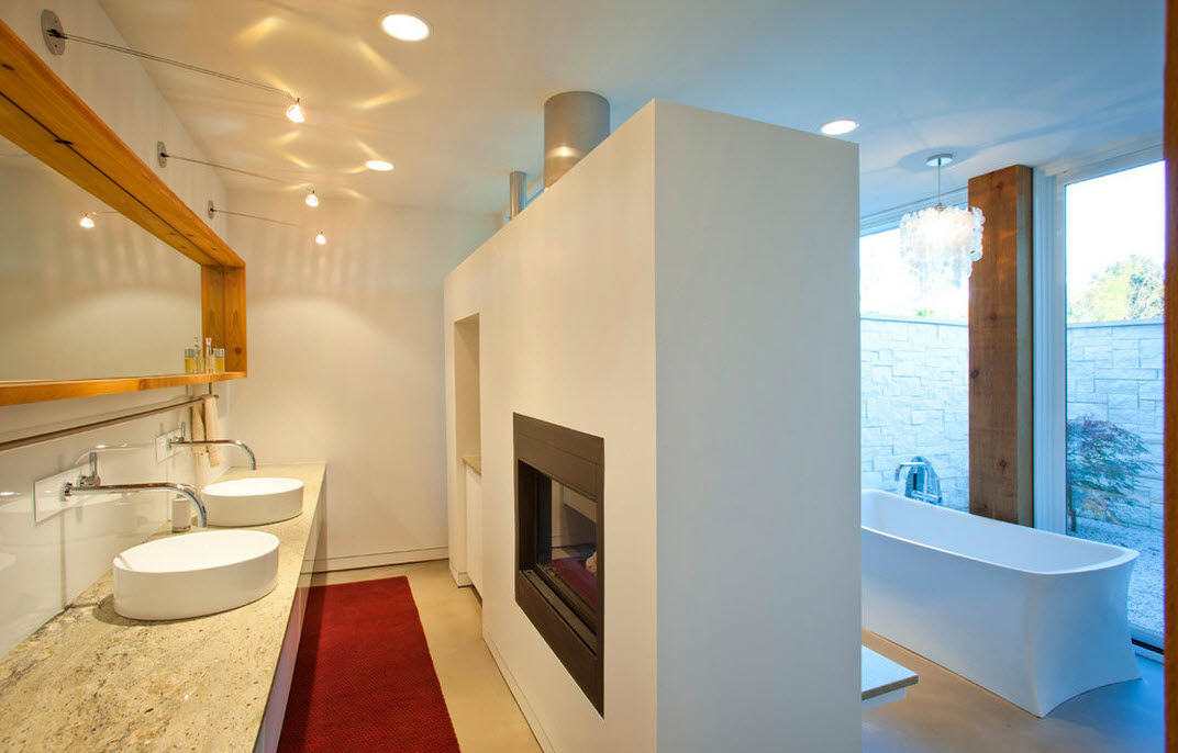 Биокамин в ванной комнате придаст ей уют, создаст ощущение тепла. Оборудовать его можно в стеновой перегородке, отделяющей зону с умывальником от ванны или душа: