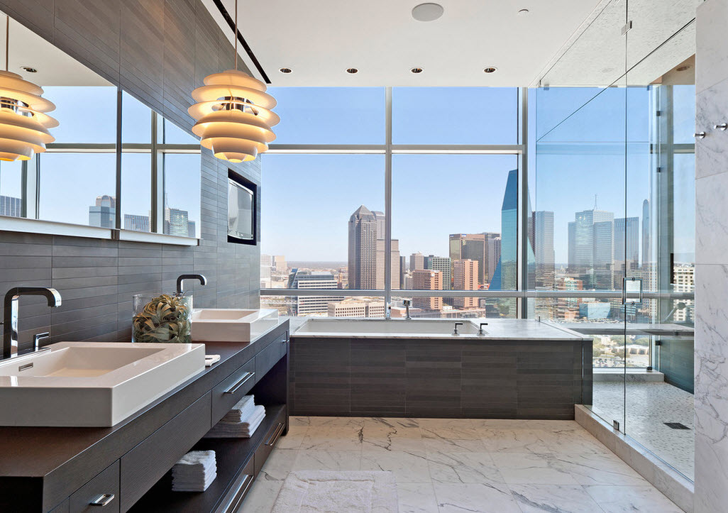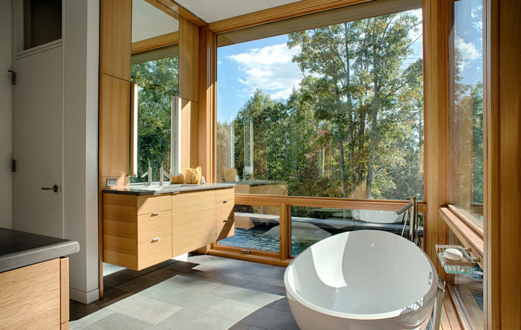 Панорамные и угловые окна – веяние моды. Безусловно, такой способ остекления смотрится превосходно, но подходит не для всех ванных комнат. Будьте готовы к тому, что окно панорамное, расположенное в непосредственной близости к ванне или умывальнику, будет часто запотевать, на нем будут оставаться следы от воды: