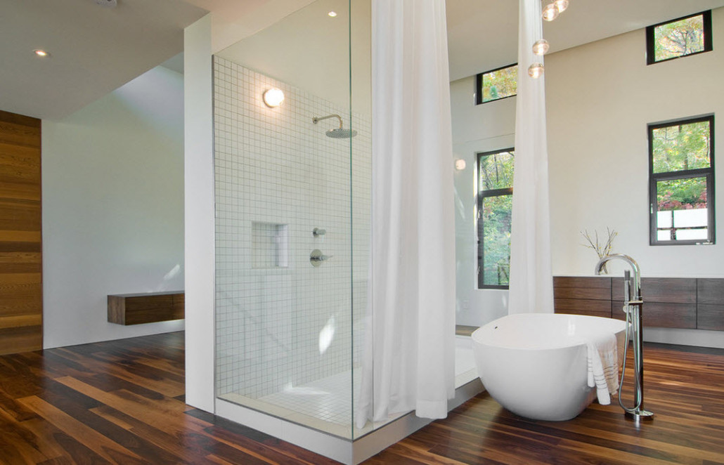 Ламинат или паркетная доска не самый практичный материал для полов в ванных комнатах. Но если вы решились на такое покрытие, нужно выбирать покрытие с повышенной влагоустойчивостью, в помещении должна быть мощная система вентиляции. Безусловно, полы, напоминающие натуральное дерево, придадут особый шарм интерьеру ванной комнаты: