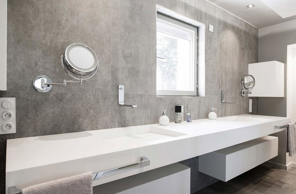 Двойные умывальники на сплошной кладкой столешнице отличаются простотой и сдержанностью дизайна: