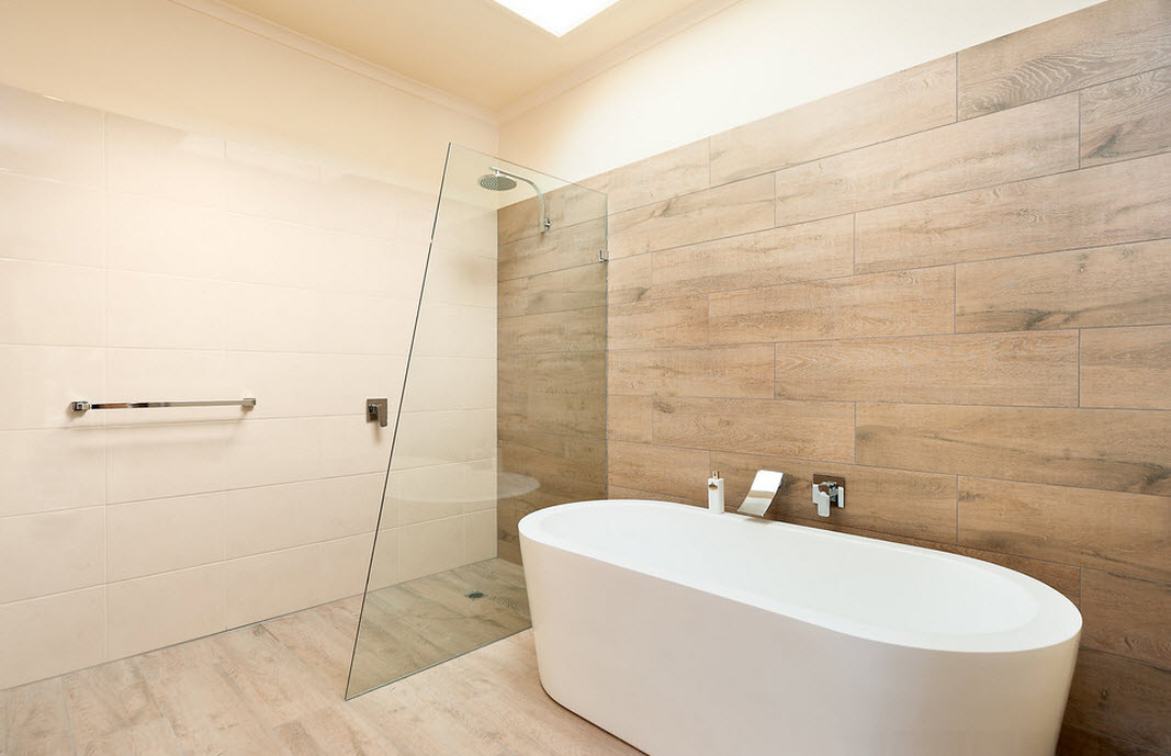 Ту часть комнаты, где непосредственно установлена ванна, можно не только отделить стеклянной раздвижной дверью или стеной, но и оформить стены другой плиткой: