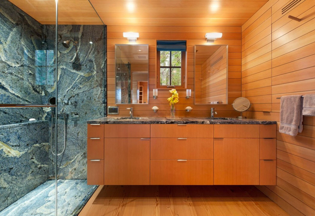 Разделить зону душа от других участков можно и с помощью разных по фактуре материалов: панели, имитирующие натуральный гранит контрастируют с панелями под деревянную вагонку: