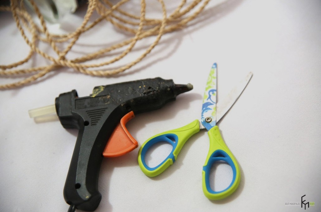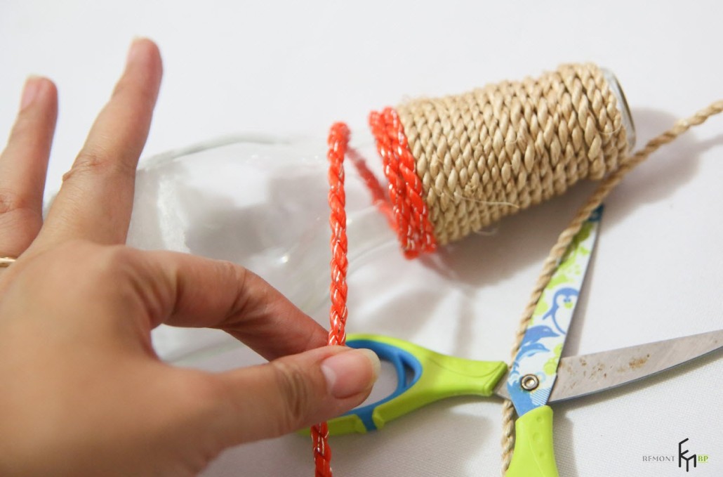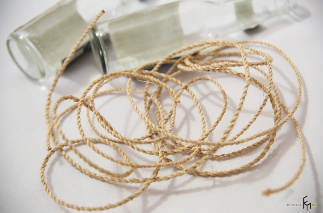 2. Декорирование вазы следует начинать со шнура натурального цвета. Смазываем конец приготовленной веревки клеем и фиксируем его у самого края горлышка бутылки. Приступаем к наклеиванию шнура. Для фиксации декоративного материала можно воспользоваться одним из двух способов: