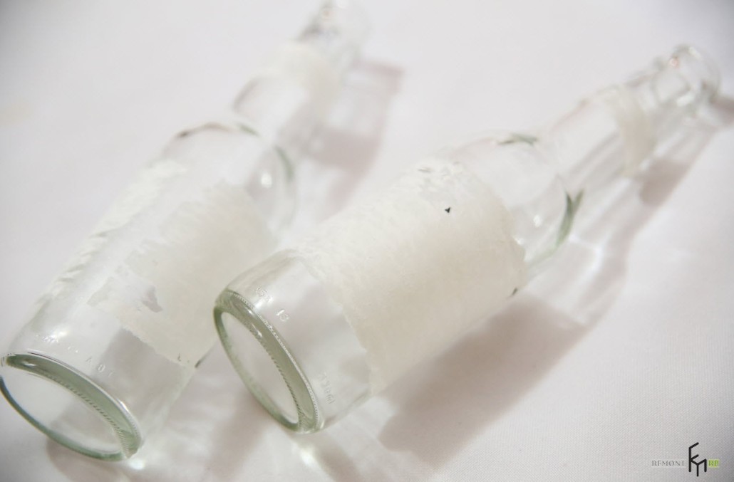 1. Возьмем пустую стеклянную бутылку. Для реализации идеи подойдет любая тара, однако, лучше всего, остановить свой выбор на емкости оригинальной формы, имеющей устойчивое основание. Бутыль следует тщательно вымыть и хорошо просушить, при необходимости стекло можно обезжирить при помощи спирта. Счищать этикетки до конца необязательно, поскольку бумажные наклейки обеспечивают дополнительное сцепление материалов.