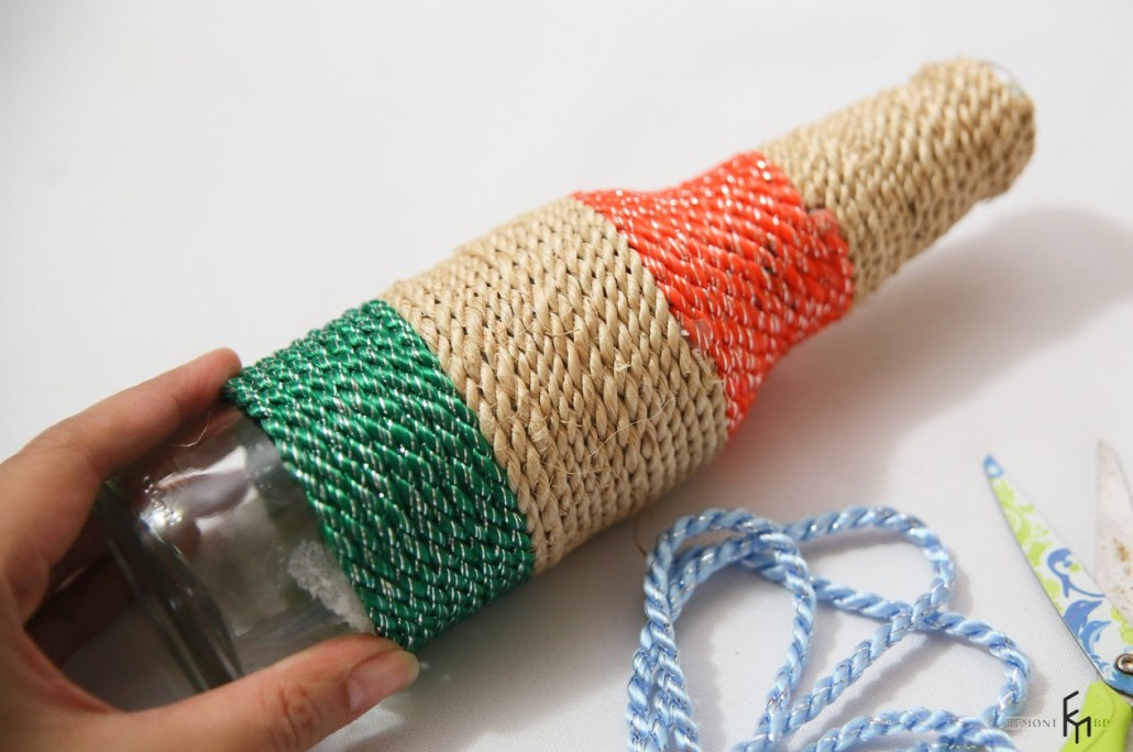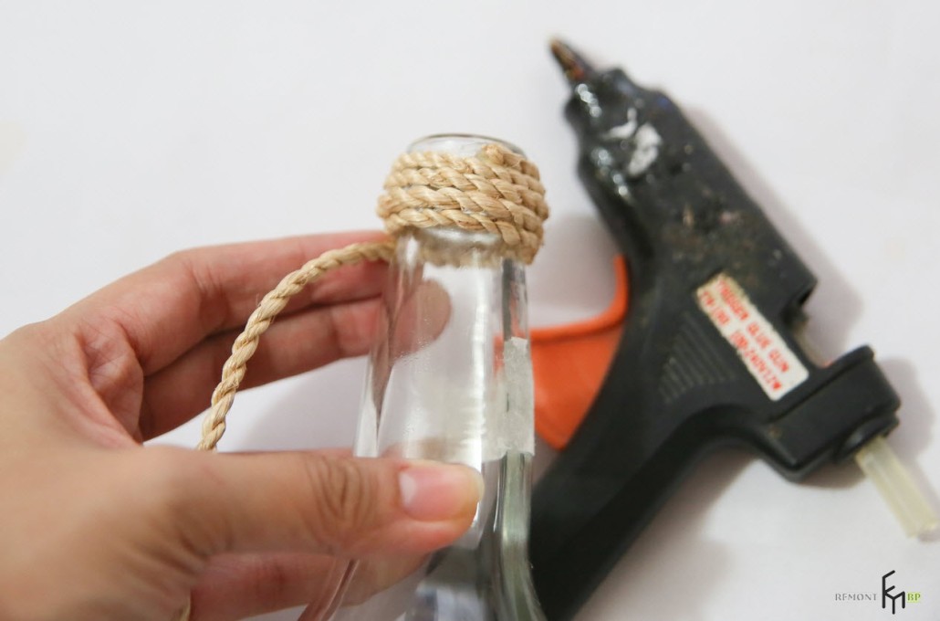 • наносить клей на веревку, а потом приклеивать ее к бутылке;