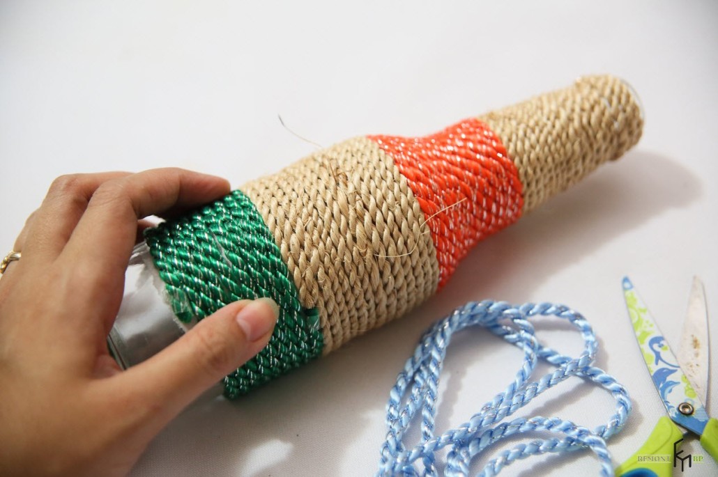 3. Продолжаем обматывать емкость шнуром. Обработав определенную часть вазы, следует отрезать веревку, и продолжить декорирование материалом другого цвета. Количество полос и соотношение цветов будет зависеть от основной идеи и ваших цветовых предпочтений.