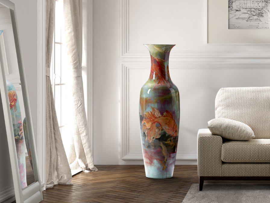 К напольным вазам относятся большие по размеру изделия, достигающиеся в высоту не менее 40 см. Подобные модели не рекомендуется зажимать между мебельными предметами либо использовать для украшения небольших комнат. Они нуждаются в пространстве, наличие которого позволит в полной мере продемонстрировать их внешнюю привлекательность.