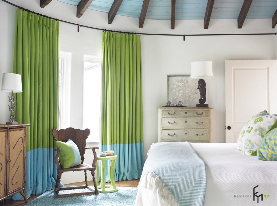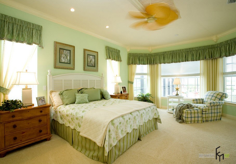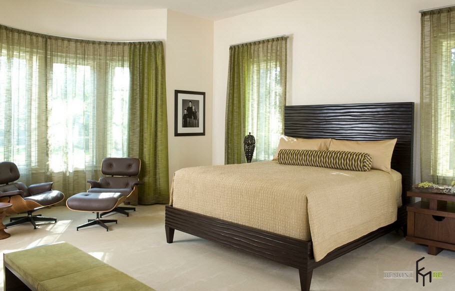 3. Добиться гармоничности в интерьере можно не только благодаря превосходному сочетанию цветов, но с помощью удачного подбора фактуры ткани для штор. В небольших светлых комнатах, а также в спальнях лучше повесить легкие полупрозрачные занавески с зеленоватым оттенком.
