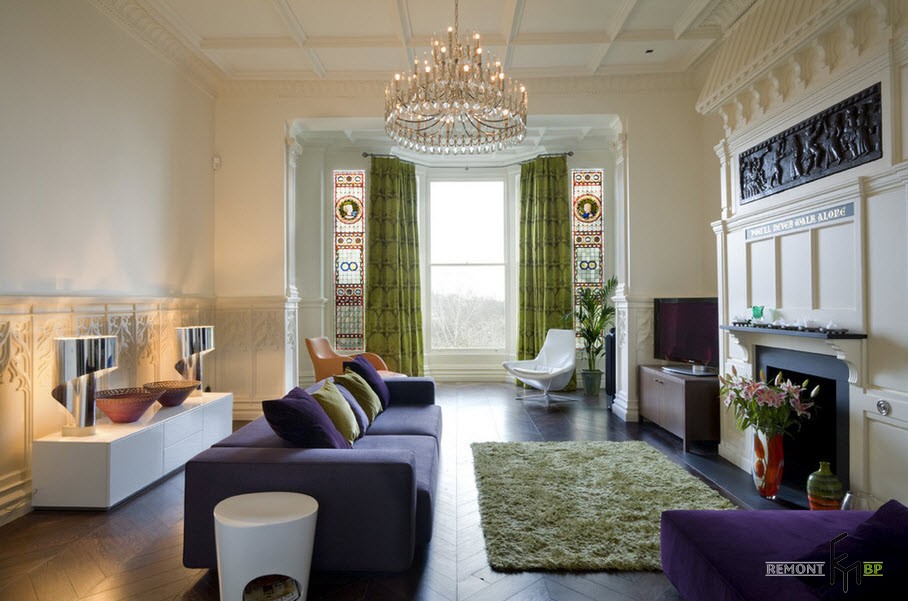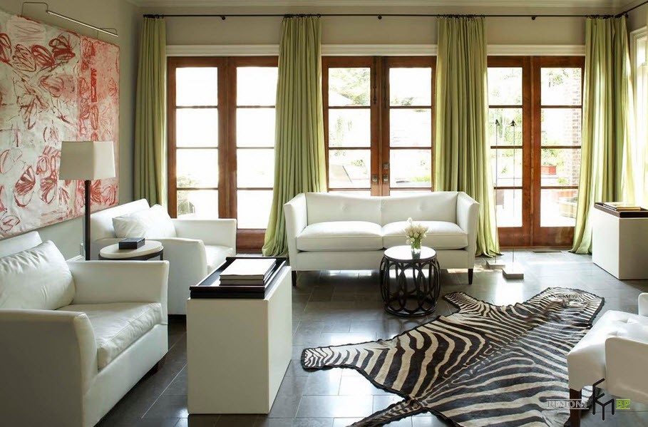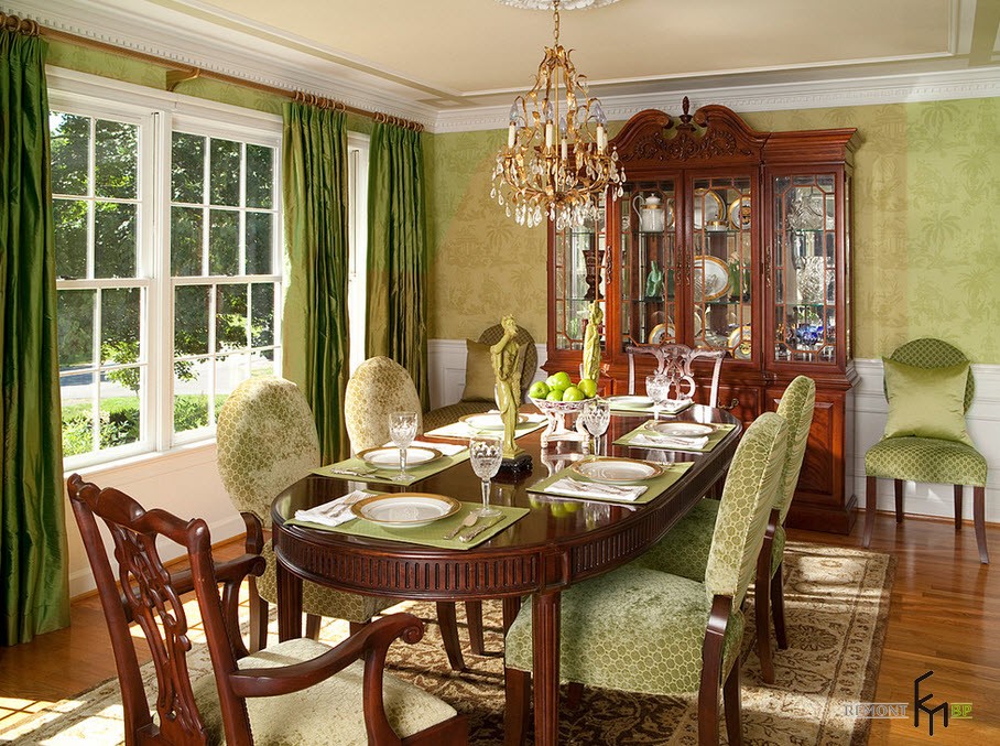 1. Выбирая портьеры, прежде всего, следует ориентироваться на реальную площадь комнаты. В маленьком помещении на фоне обоев с мелким рисунком более выигрышно будут смотреться светло-зеленые шторы. А для внушительного пространства больше всего подойдут яркие и темные портьеры. Обои при этом могут сопровождаться крупным и ярким орнаментом.