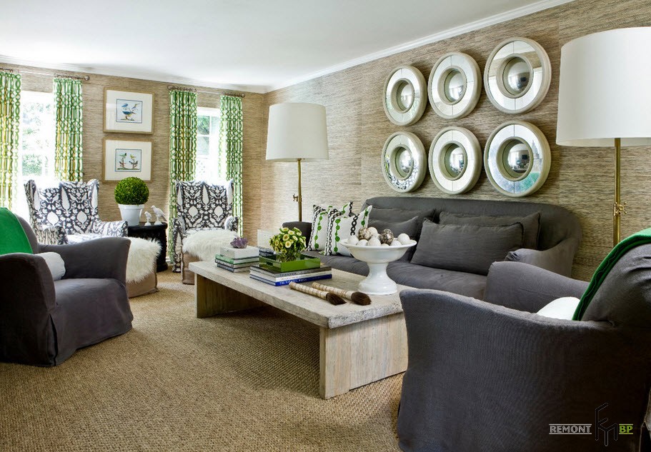 Эта комбинация цветов также считается классической. Такая цветовая палитра больше всего подойдет любителям строгого стиля. Основным моментом здесь является выбор оттенка серого цвета. Зеленый цвет при этом может быть любым – как темно-изумрудным, так и светло-бирюзовым.