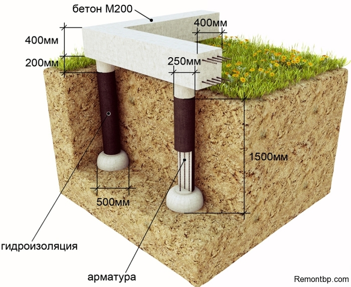 Столбчатый (на сваях) – подойдет для зданий, в основе которых лежат стены со сравнительно лёгкими конструкциями. Главными элементами таких фундаментов считаются кирпичные, железобетонные либо же каменные сваи. Этот вид фундамента самый бюджетный, не требующий значительных капиталовложений.