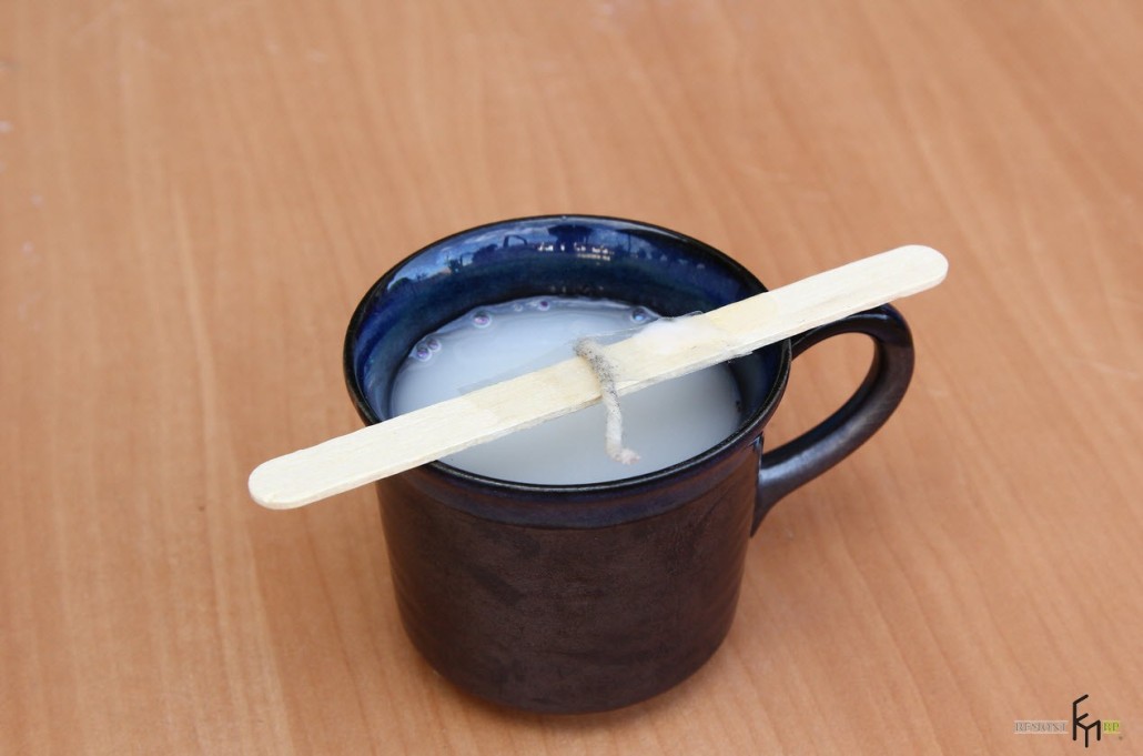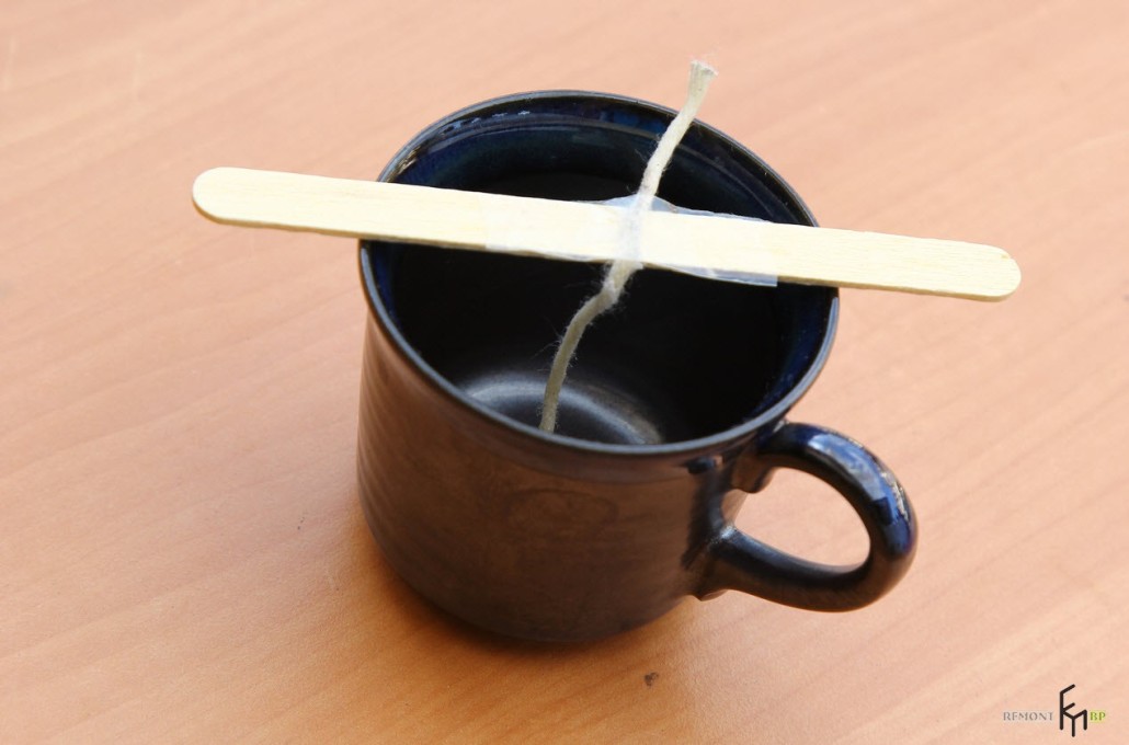 - К деревянной палочке посередине прикрепите скотчем фитиль и опустите его на дно чашки так, чтобы концы палочки лежали на краях чашки: